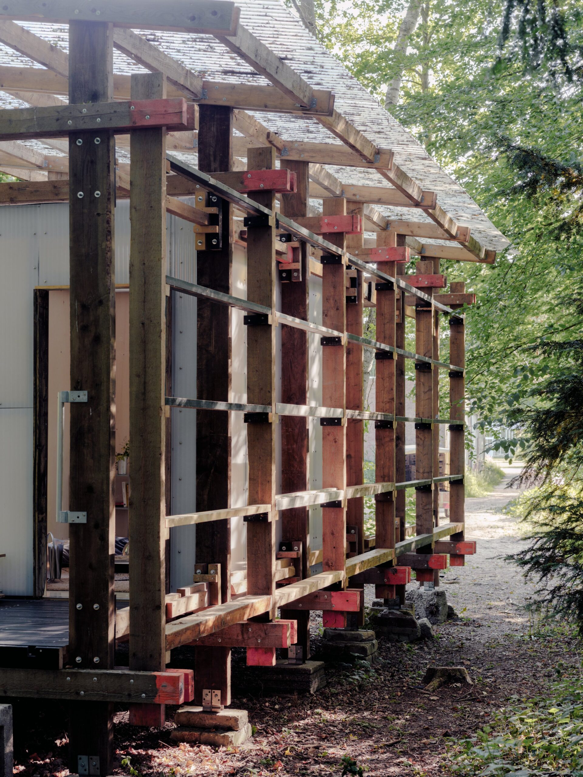 To manage the irregular sizes and properties of reused materials, the team separated the insulated timber core from the roof and foundation. This made the structure more adaptable. They also designed custom joints to handle inconsistencies in dimension, allowing various materials to fit together seamlessly.
