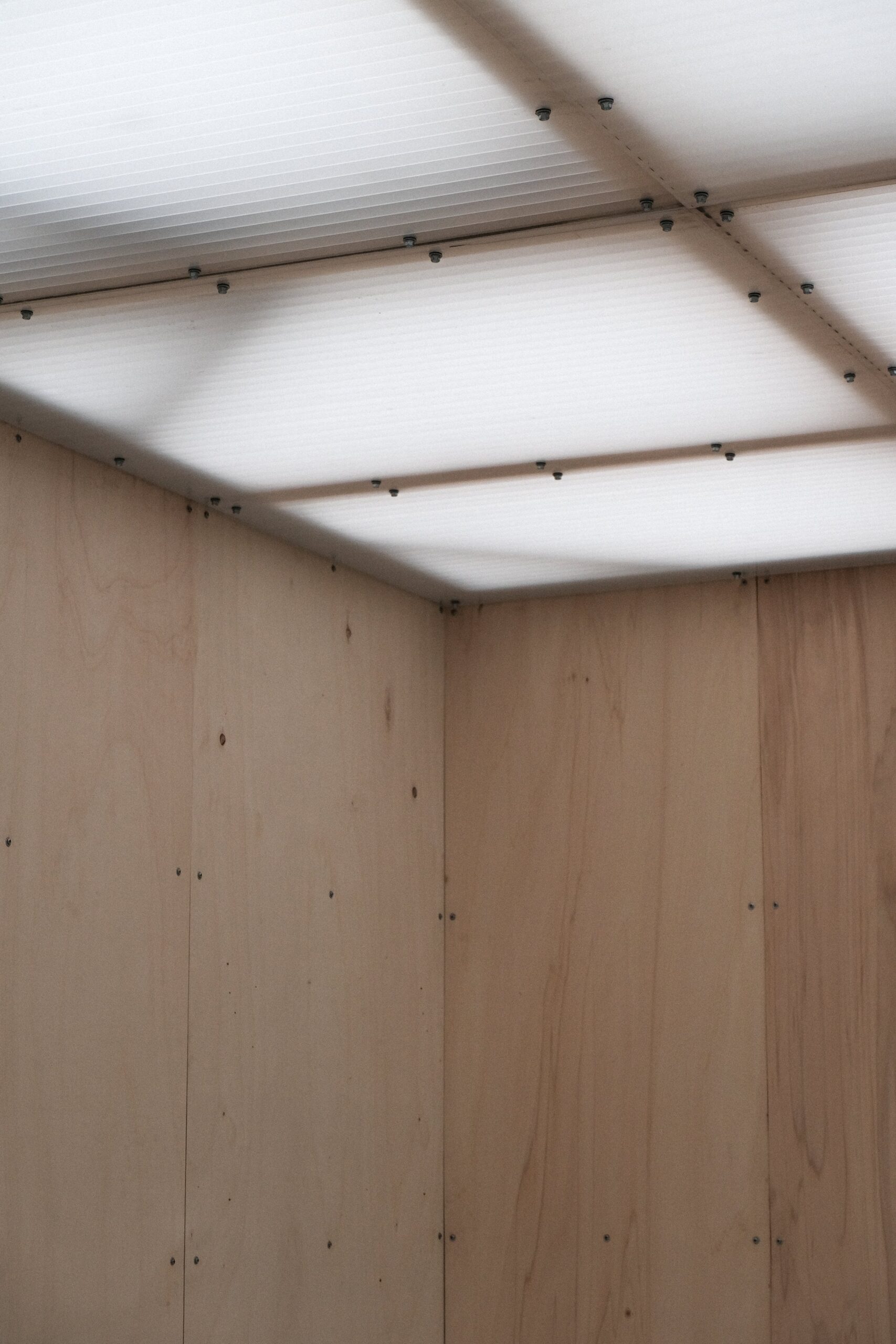 Studio Method built the pavilion with a modest budget of €15,000 and a small team. Rather than buying new materials, they focused on restoring what was available. They cleaned decades-old acrylic panels, washed raw wool by hand, and refurbished wooden window frames. This slow, hands-on method made the most of every component.