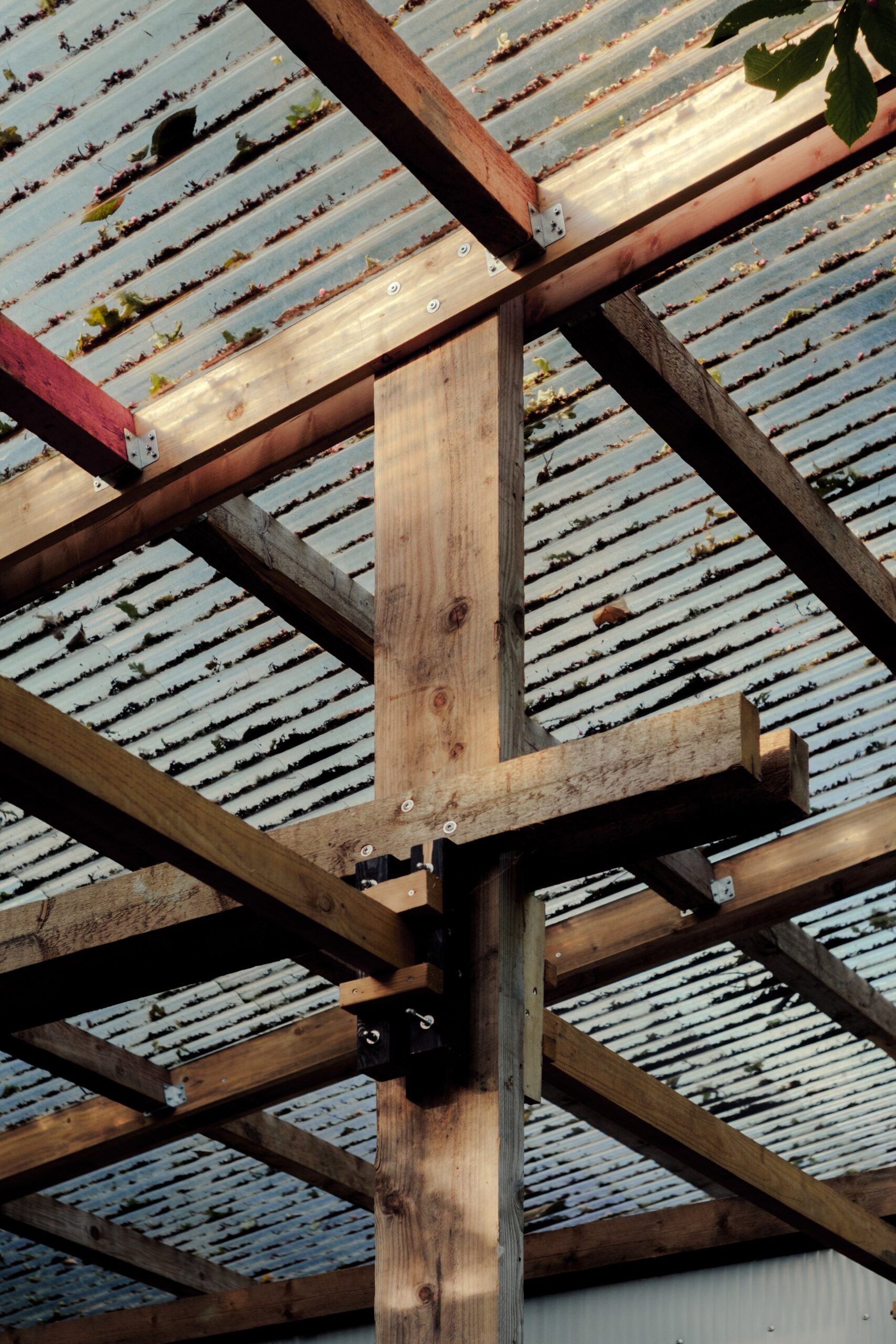 For instance, 30% of the materials came directly from the site itself. This included reclaimed timber, greenhouse panels made of extruded acrylic, concrete debris from demolished structures, and salvaged wood. The design also made use of waste wool from local farms and mineral wool insulation from a renovation project.