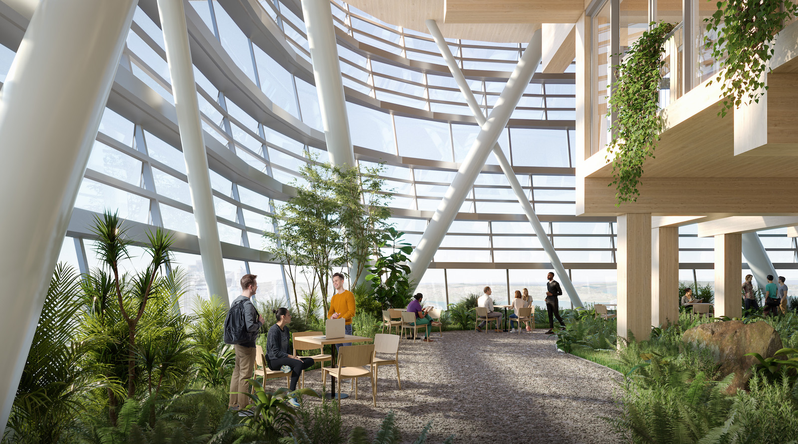 At the centre of the design is an innovative hybrid timber structural system. The office floors are organised into seven stacked four-storey modules, referred to as “habitats”. Each habitat creates a flexible workspace that focuses on daylight, natural ventilation and wellbeing. Moreover, the modules connect directly to landscaped terraces, which introduce outdoor space into the high-rise workplace.