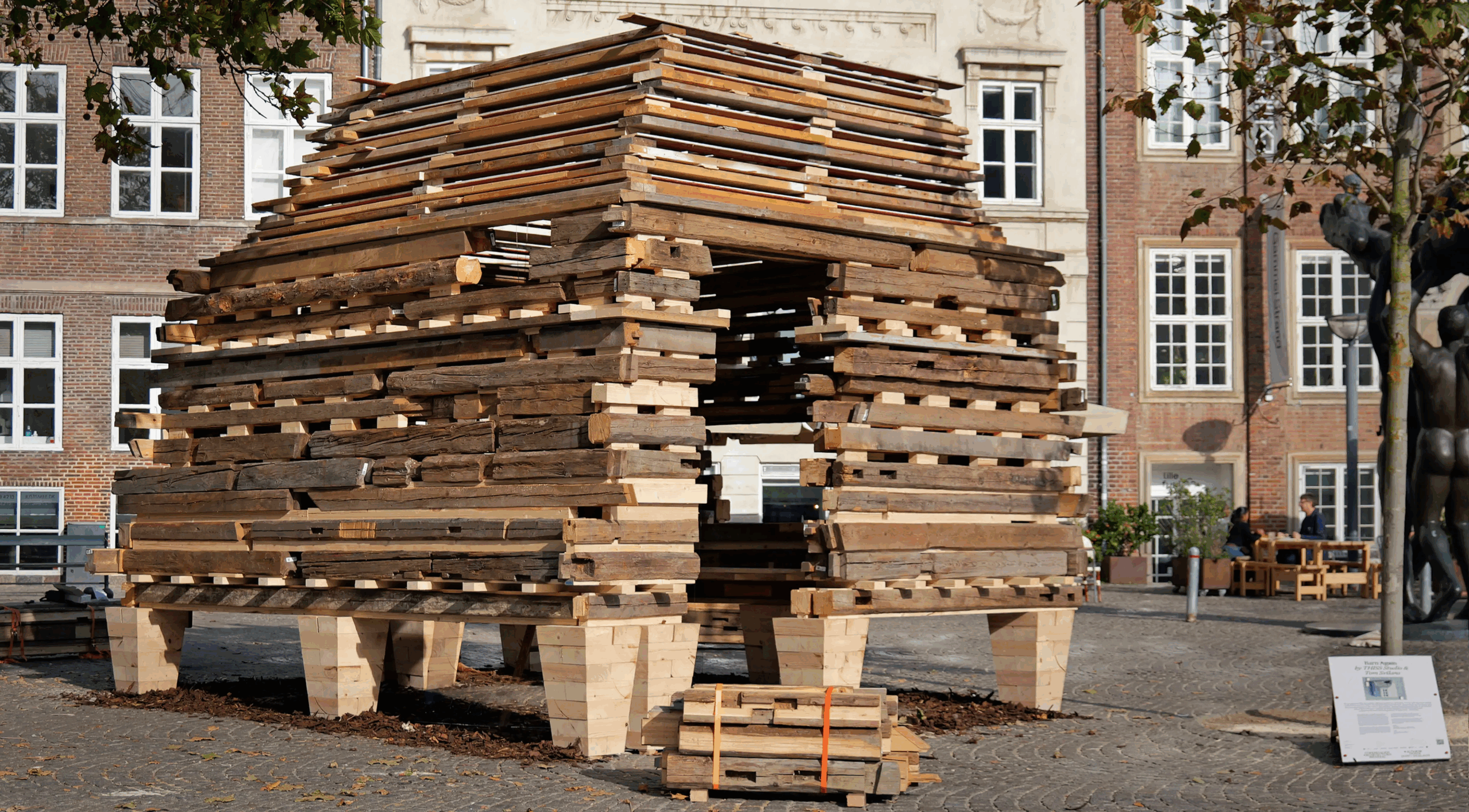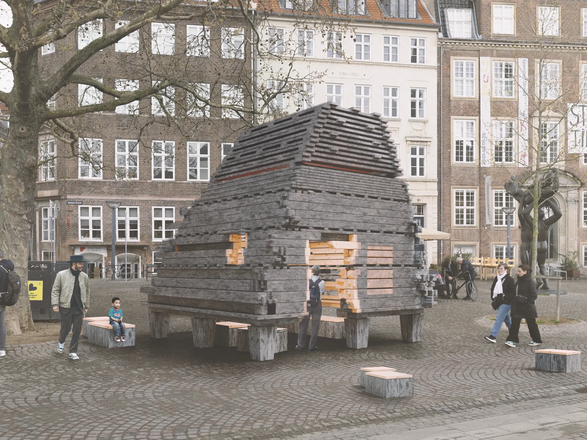 Barn Again combines the tactile qualities of aged, reclaimed timber with the precision of machine-made joinery. The structure forms a cocoon-like pavilion in the plaza at Gammel Strand, where its rural typology contrasts with the urban setting.