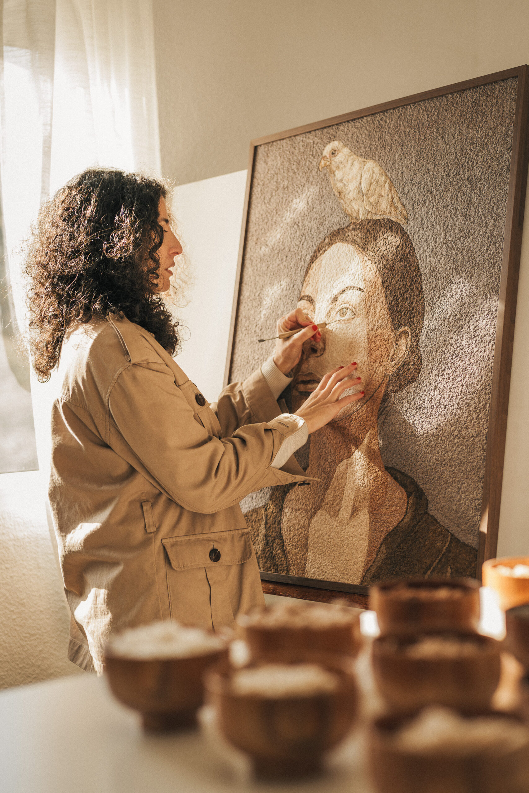 Spanish artist Cynthia Nudel has developed Biopainting, a material-based technique that replaces conventional paint with textile waste and natural pigments. Her work explores how discarded materials can become expressive artworks. At the same time, it questions the environmental impact of the textile and pigment industries.