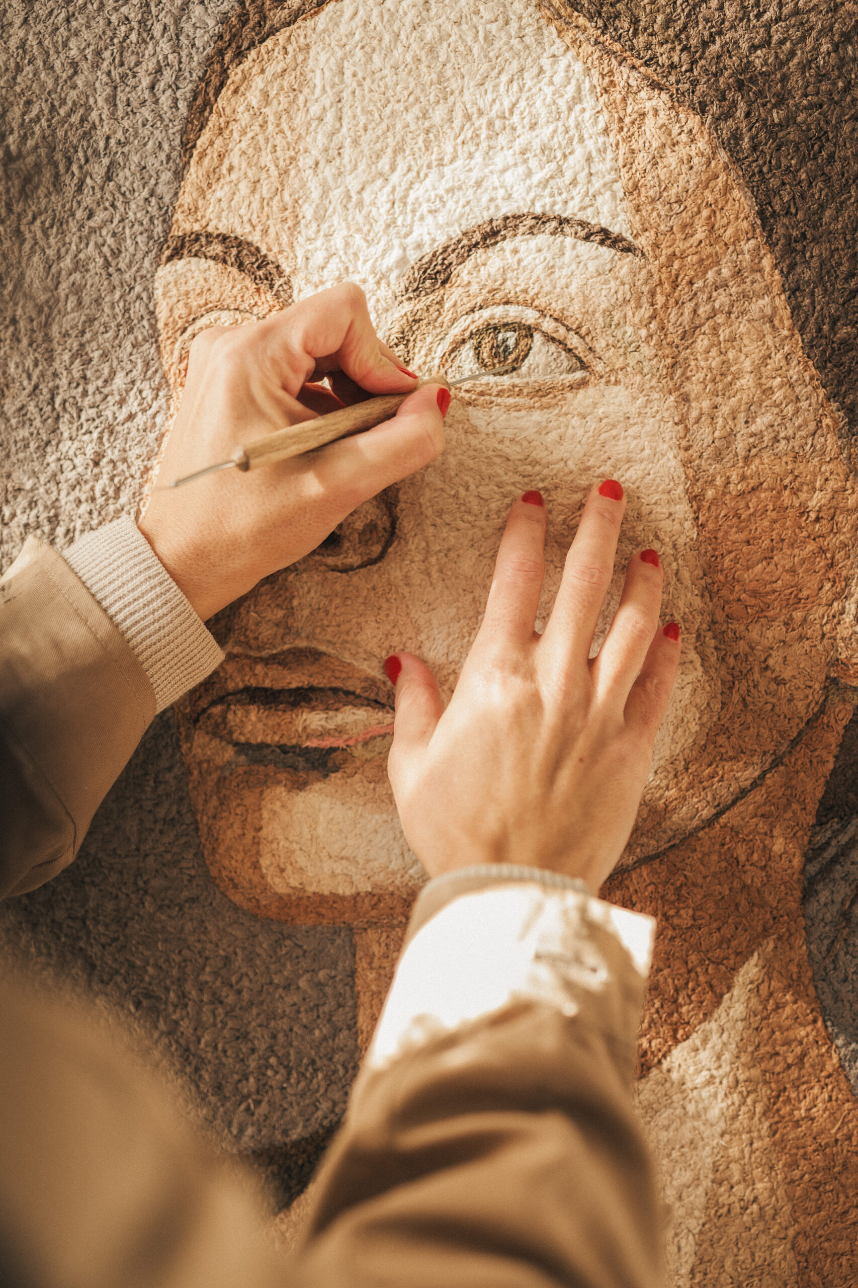 Instead of using acrylics or oils, Nudel works with leftover textiles. She dyes these fabrics using colour extracted from organic waste streams. Onion skins, pomegranate peels and eucalyptus bark form the basis of her palette. She then cuts the dyed textiles into small pieces and fixes them onto canvas with a natural adhesive. This process creates layered, tactile surfaces that function as both image and material statement.