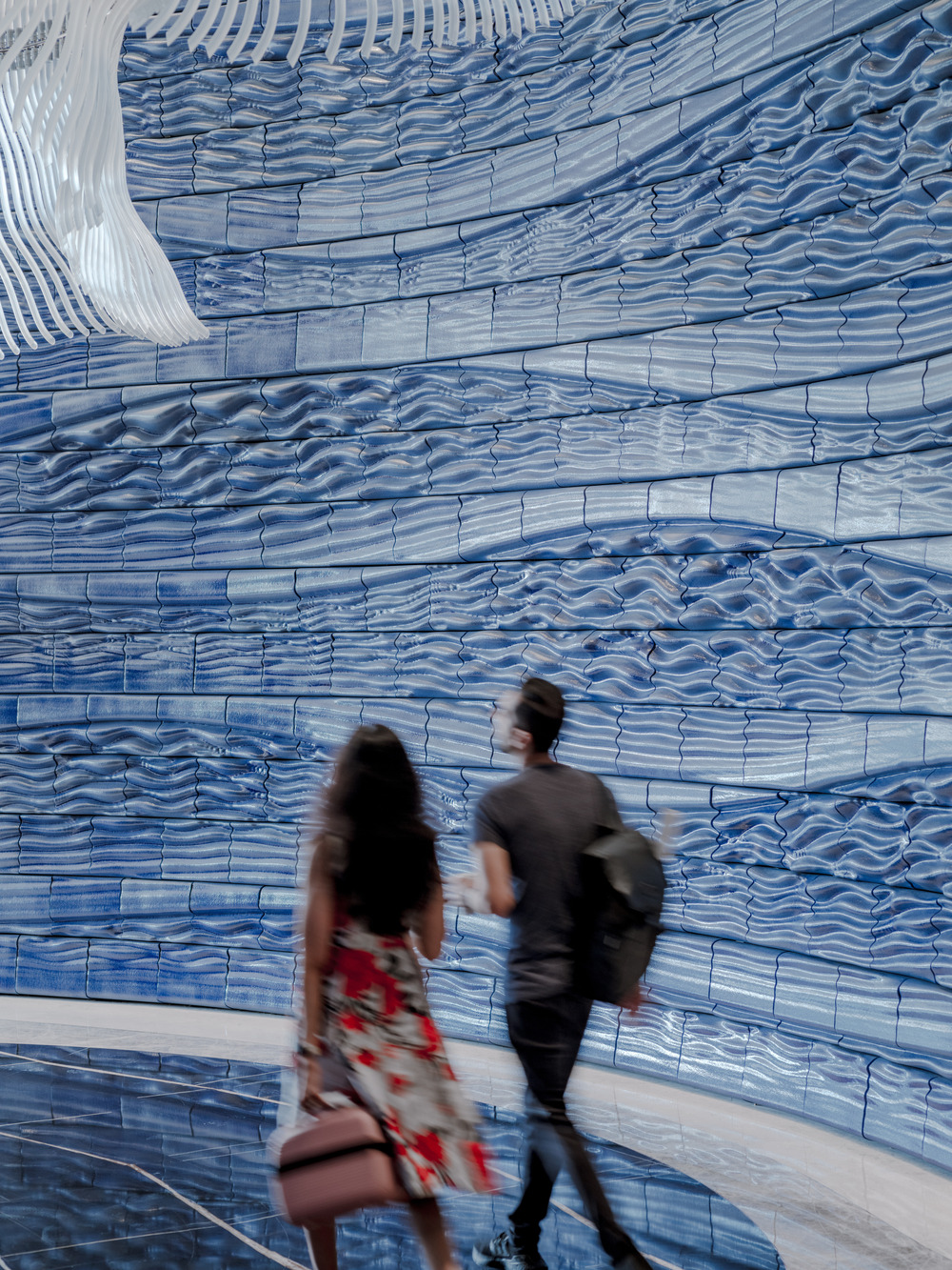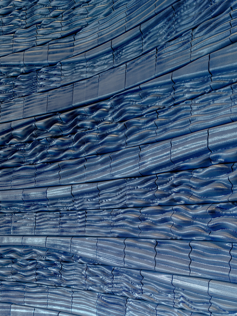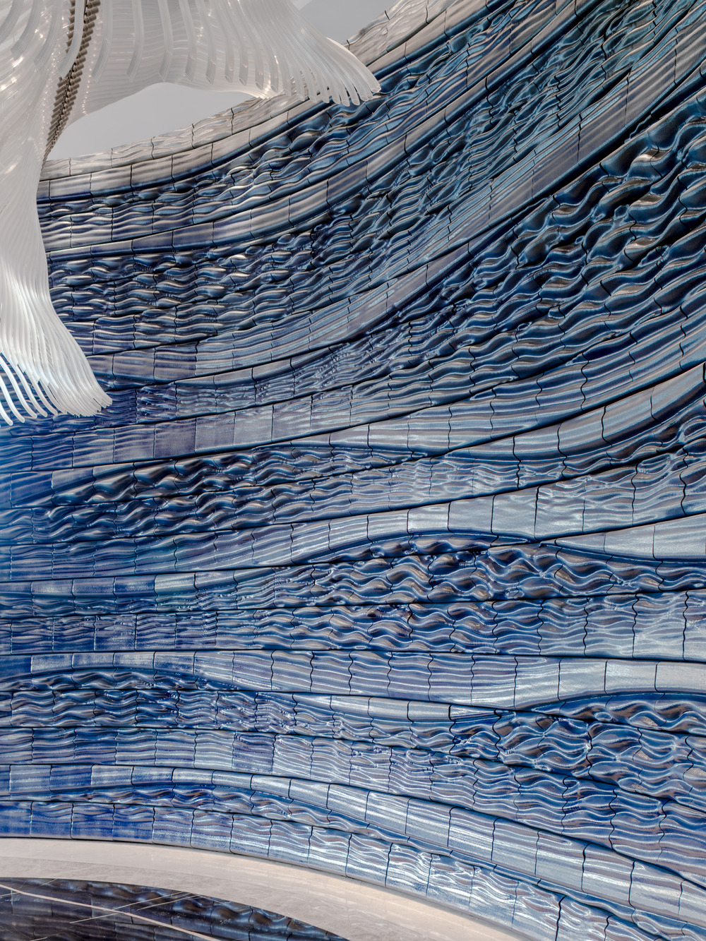Inspired by the nearby Gulf, the design captures the gentle motion of waves. Up close, the tiles reveal intricate lines and ridges that shift with the light throughout the day. Special corner pieces wrap the pattern seamlessly around the edges, adding a smooth sculptural quality.