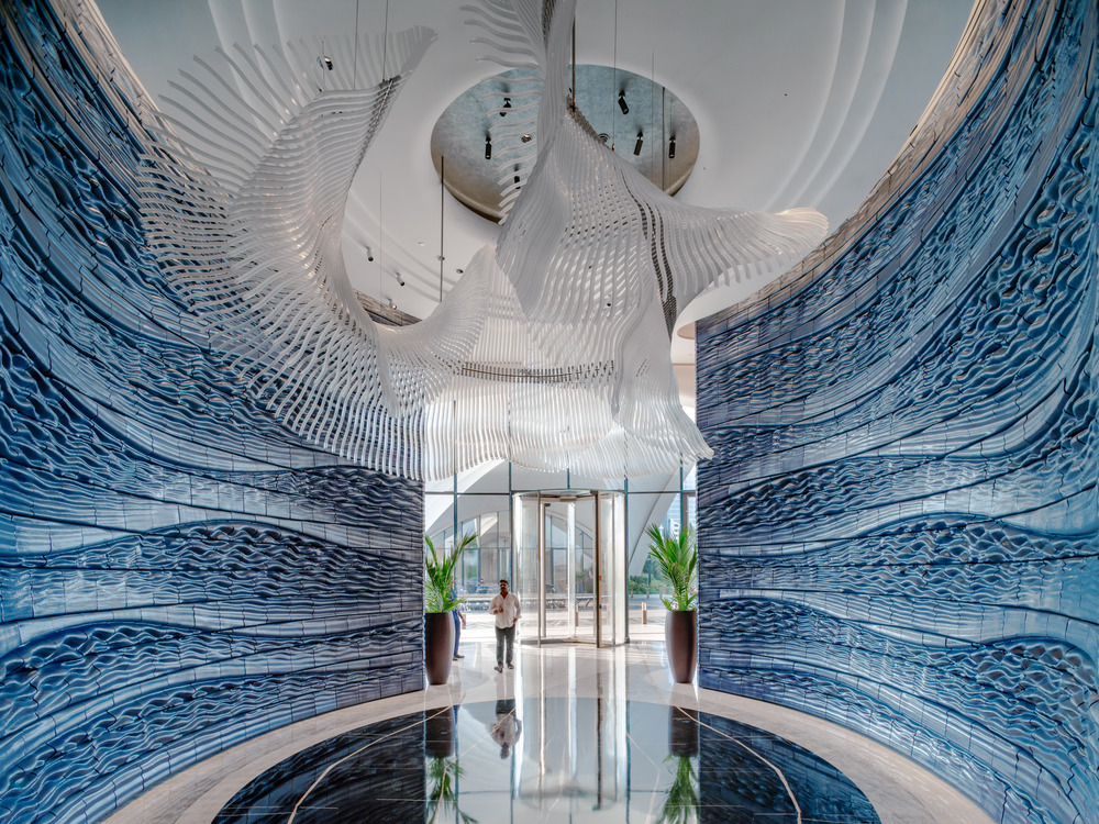 Rotterdam-based Studio RAP has created Blue Voyage, two large-scale 3D printed ceramic walls for the entrance of the new Jumeirah Marsa Al Arab hotel in Dubai. Placed on either side of the lobby, the walls form a sculptural gateway that combines advanced fabrication with a poetic interpretation of the sea.