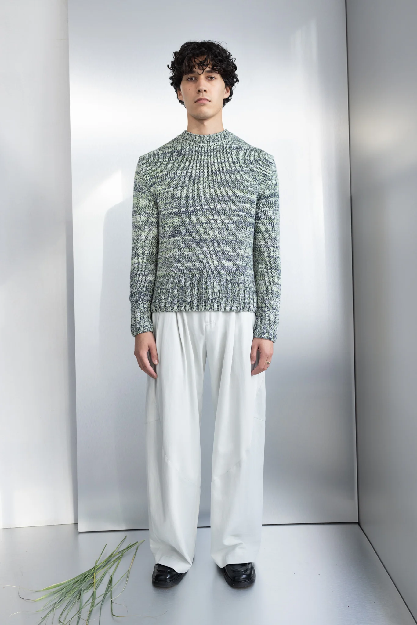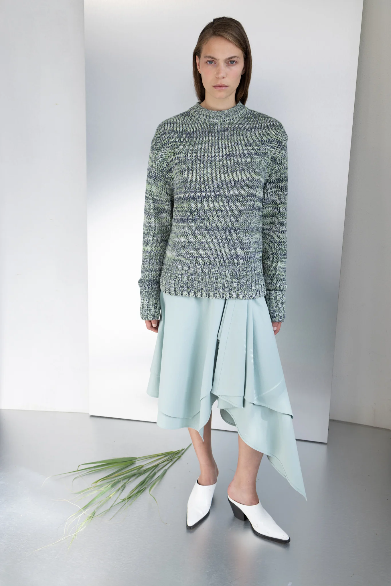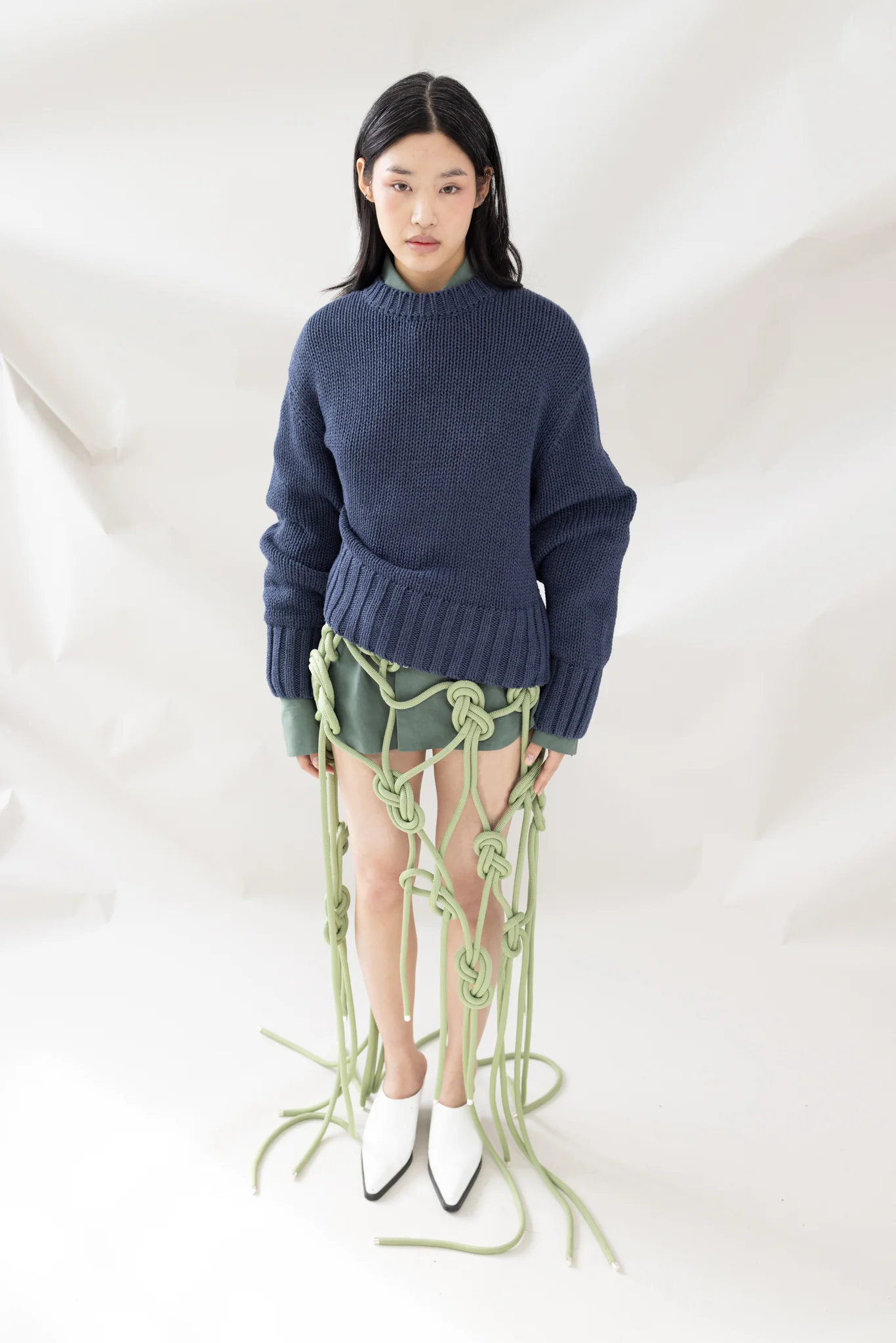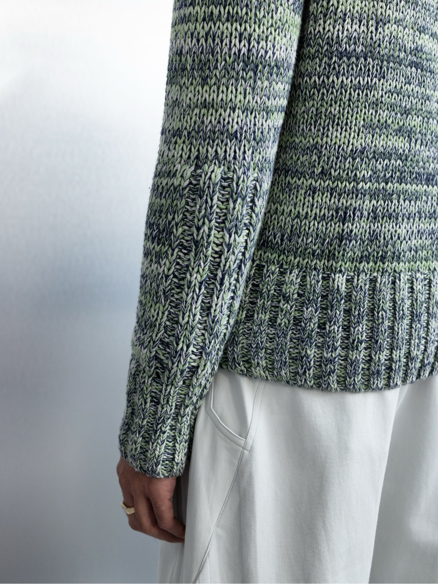 MARTAN releases the jumper in two colourways: a deep anthracite blue and a mélange of ice grey, blue and fresh green. The cropped silhouette, structured rib and half-high neckline reflect MARTAN’s sculptural design approach. The material itself tells the story of Brightfiber’s circular craftsmanship. Each piece shows how designers can combine aesthetic value with responsible material use.