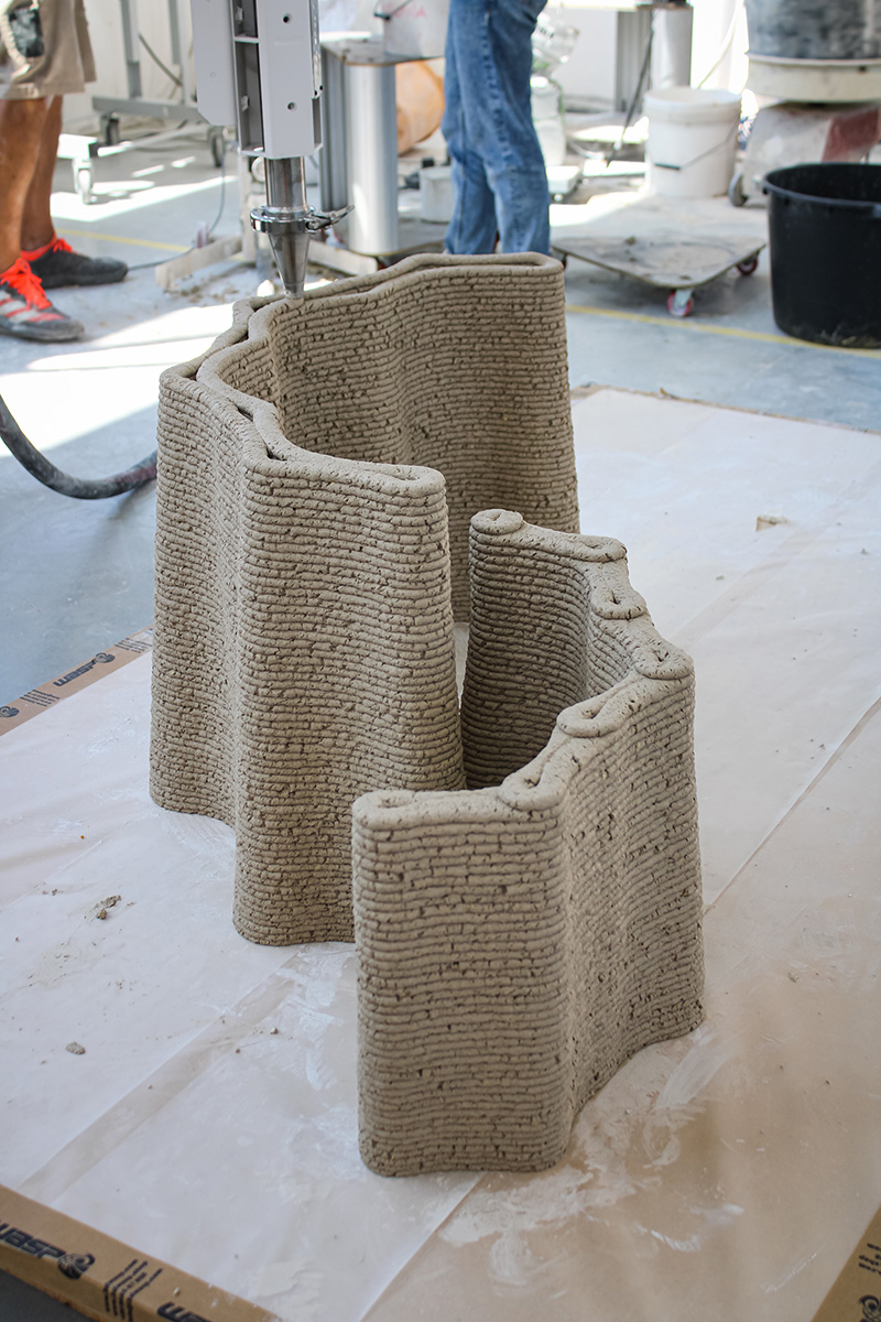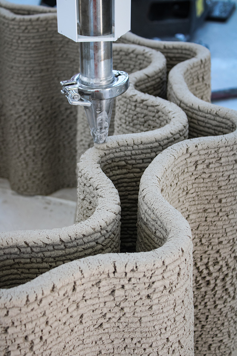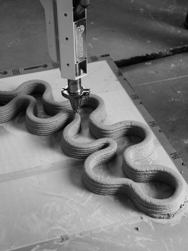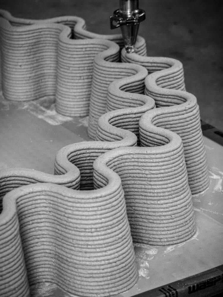 MANUFACTURA optimised CORNCRETL for additive manufacturing. The team tested the mixture using a WASP Concrete HD Continuous Feeding System combined with a KUKA robotic arm. They printed three wall prototypes at different scales and cured them at room temperature within two to three days.