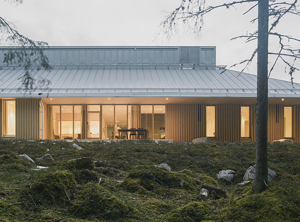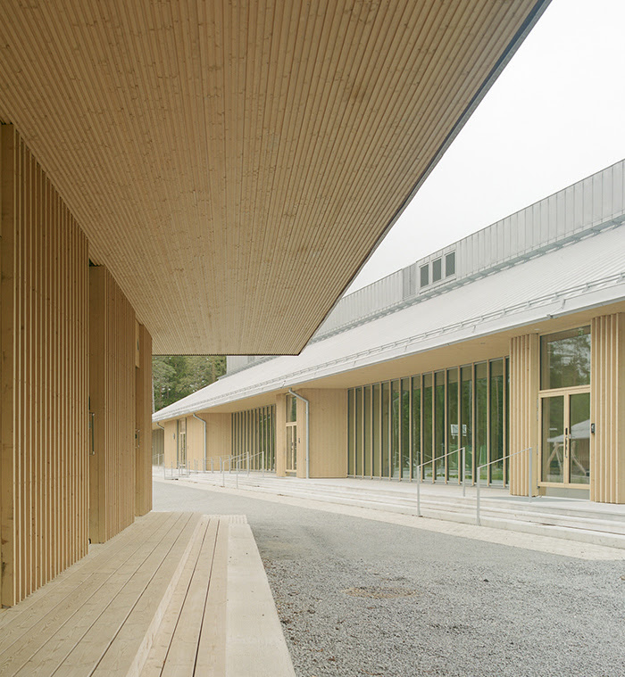 The architectural expression references regional Ostrobothnian building traditions. A single-storey layout and extended eaves define the horizontal form of the building. In addition, a light-coloured standing seam metal roof conceals technical installations and visually relates to the surrounding landscape.
