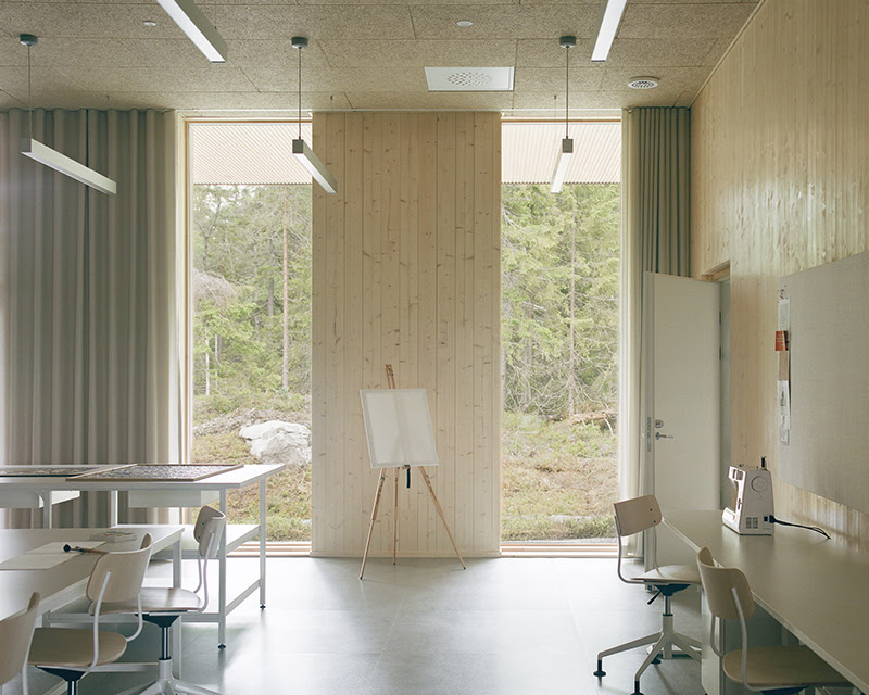 Anttinen Oiva Architects designed the complex to bring together residential, educational and administrative functions within a single site. The programme includes 20 accommodation rooms arranged across four units, as well as classrooms, recreational areas, staff facilities and a communal kitchen with dining hall. The buildings are positioned around a central courtyard that opens towards a nearby lake. This arrangement maintains views of the surrounding forest and supports access to outdoor areas.