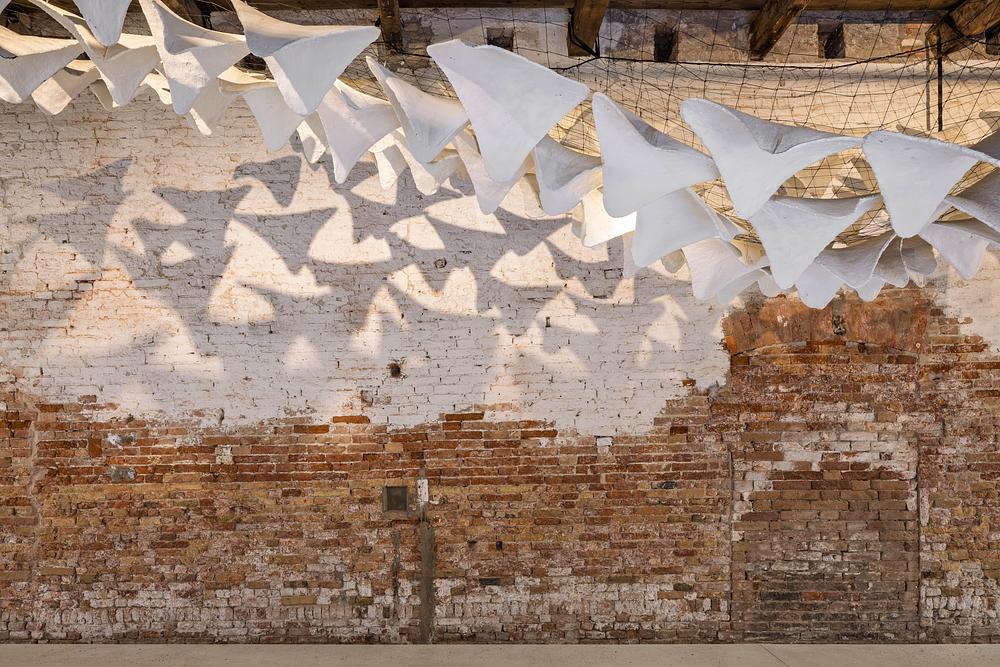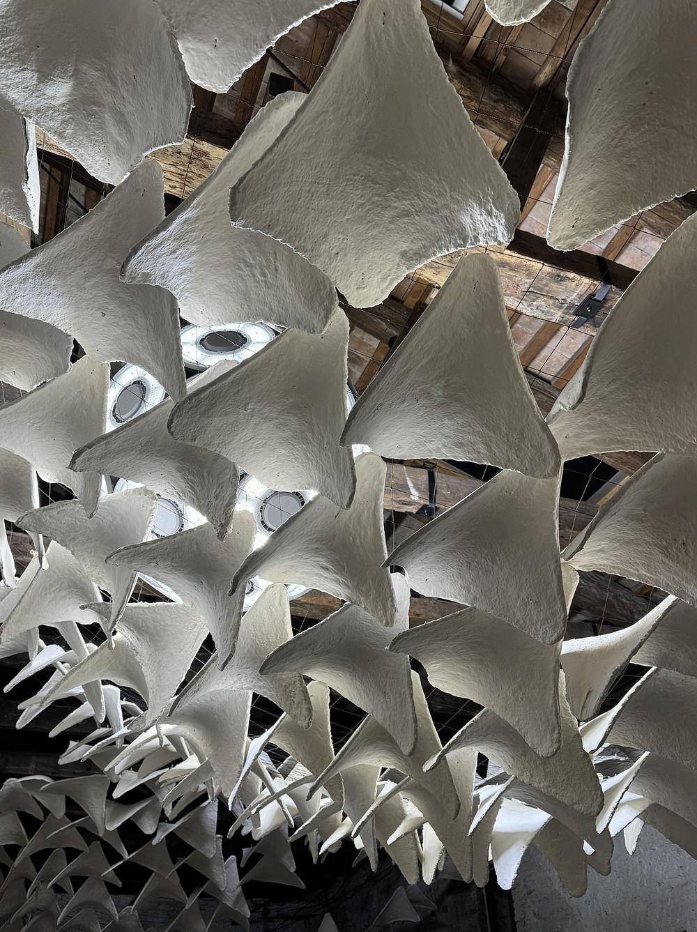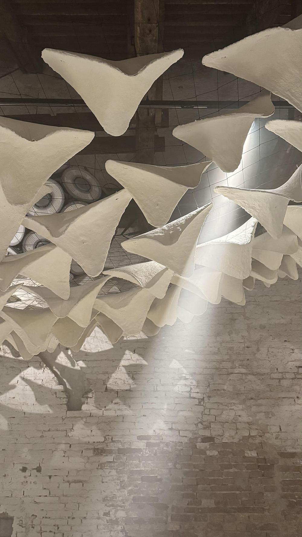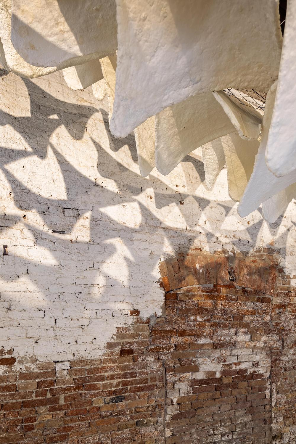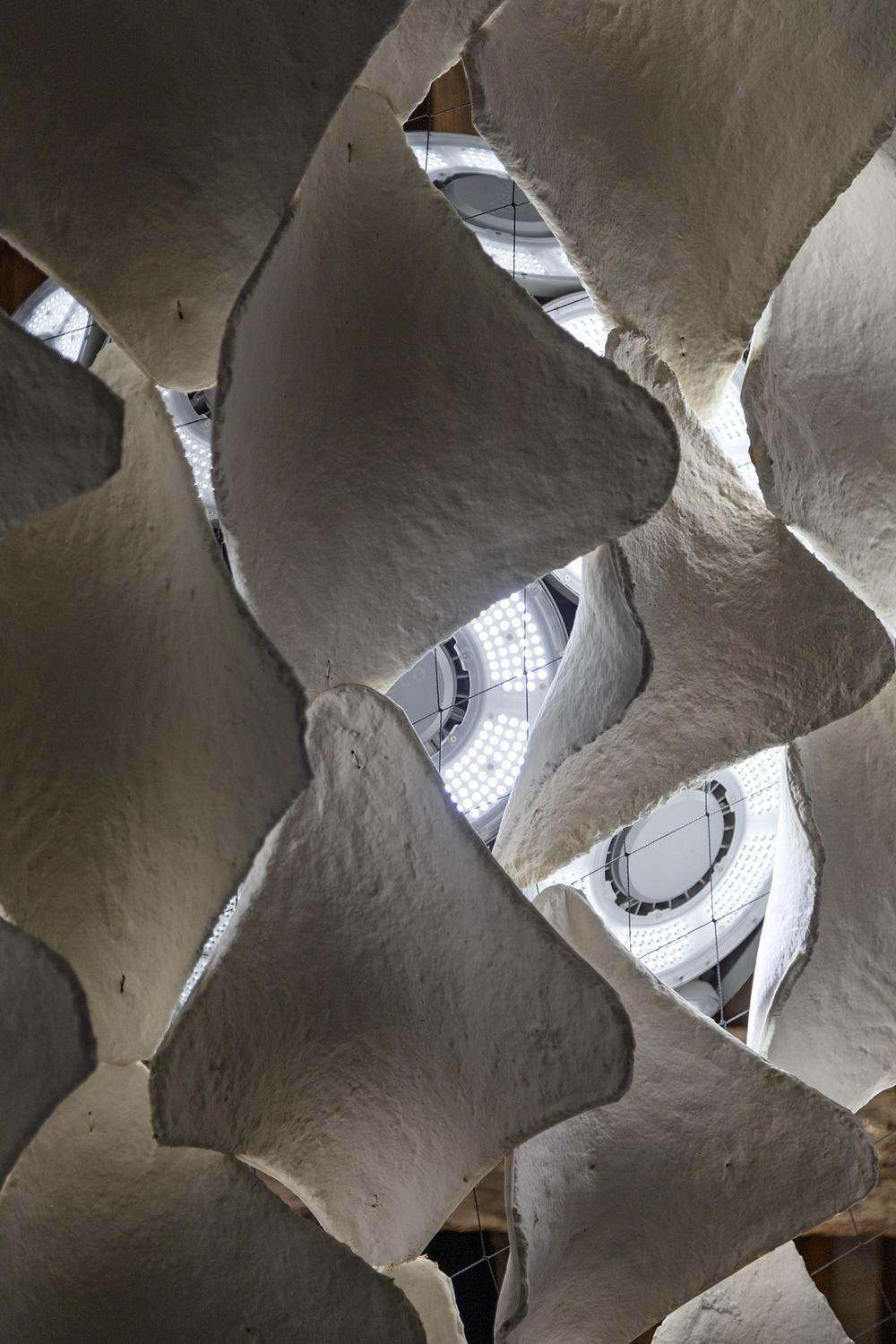 A key material innovation in Flight Into Shadow is the use of living mycelium structures. These biobased elements form lightweight canopies that filter and diffuse light. Instead of blocking light completely, the structures soften it and create gradual transitions between light and shadow.