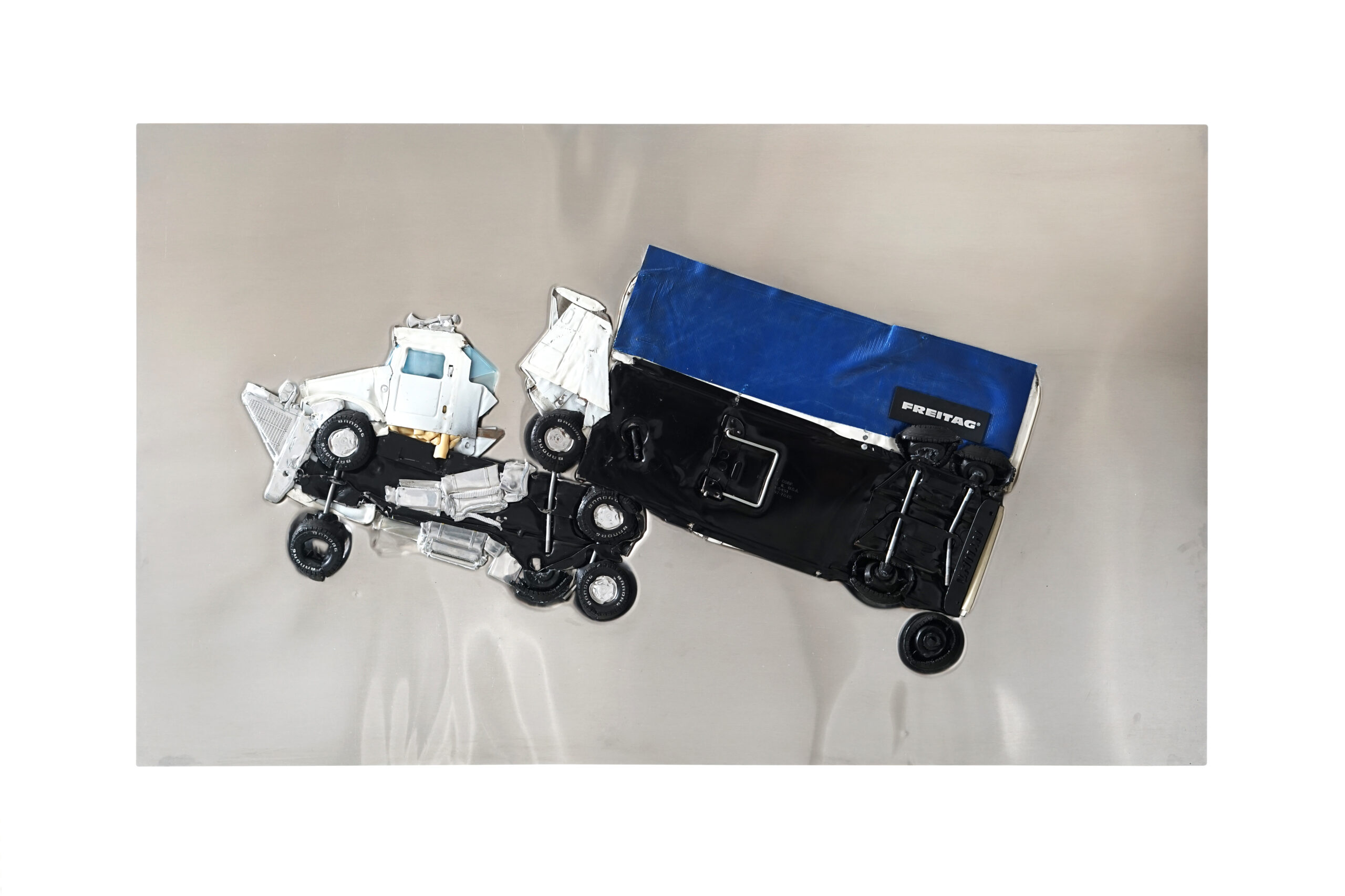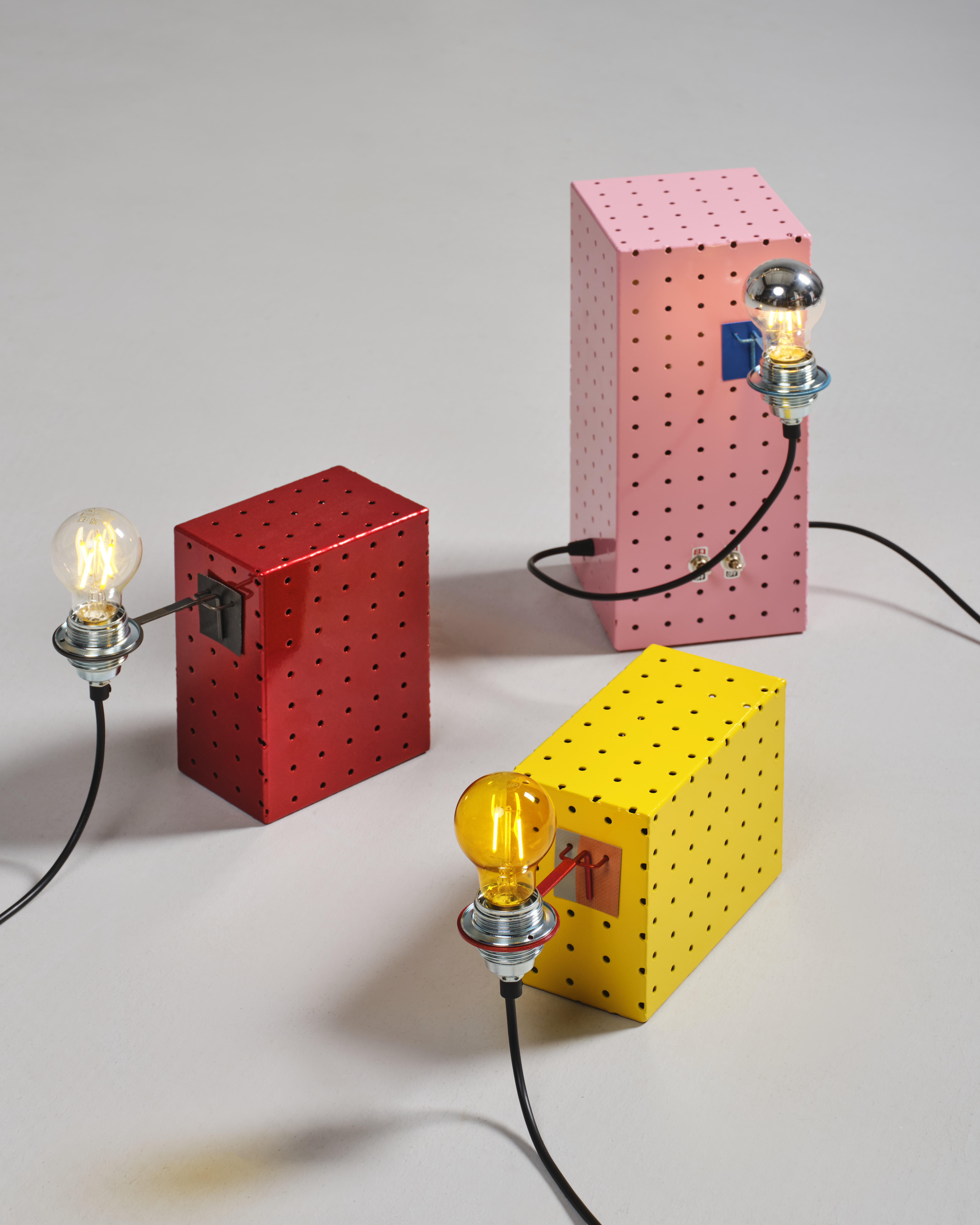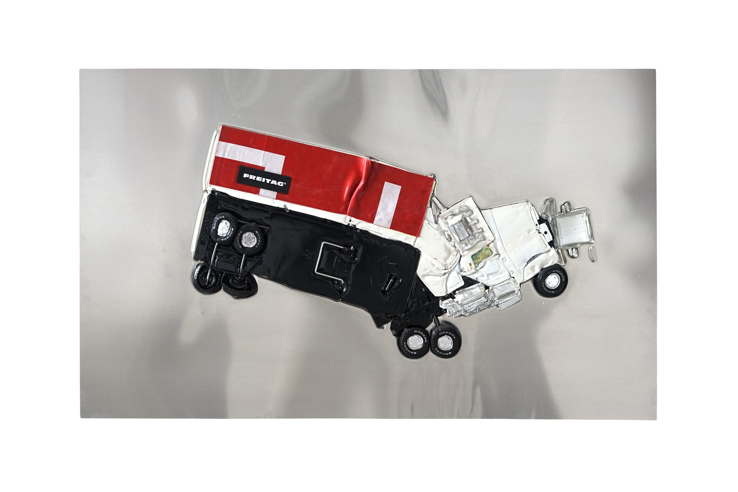 Van den Berg reused pegboards, hooks, and other elements from FREITAG Stores to create table, pendant, and floor lamps. Each design features bright truck tarp offcuts—the same recycled material used in FREITAG’s iconic bags. The collection also includes “Truck Crash” wall artworks, made by flattening toy trucks with a hydraulic press. The process references Van den Berg’s earlier Car Crash series and celebrates the brand’s roots in road materials.