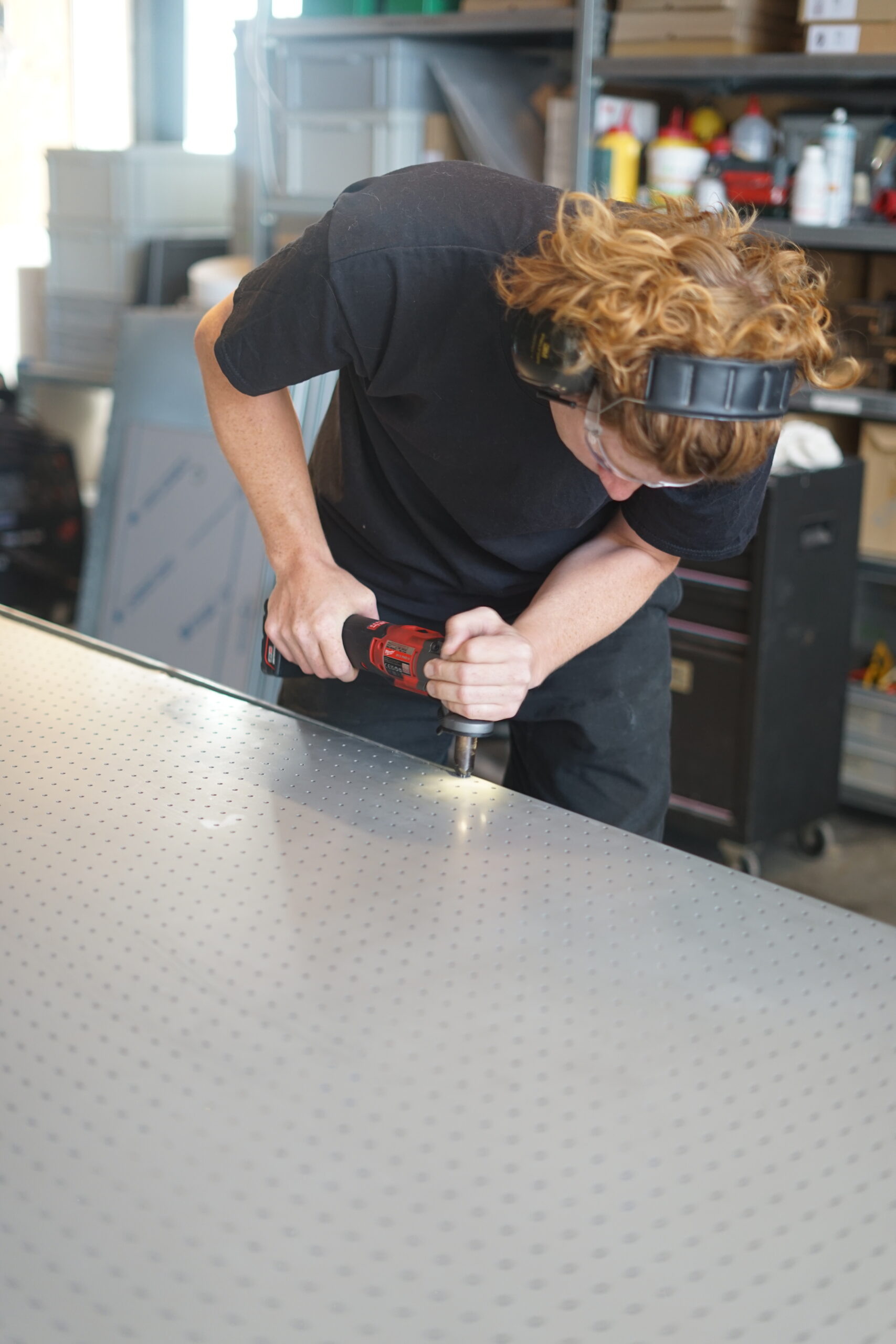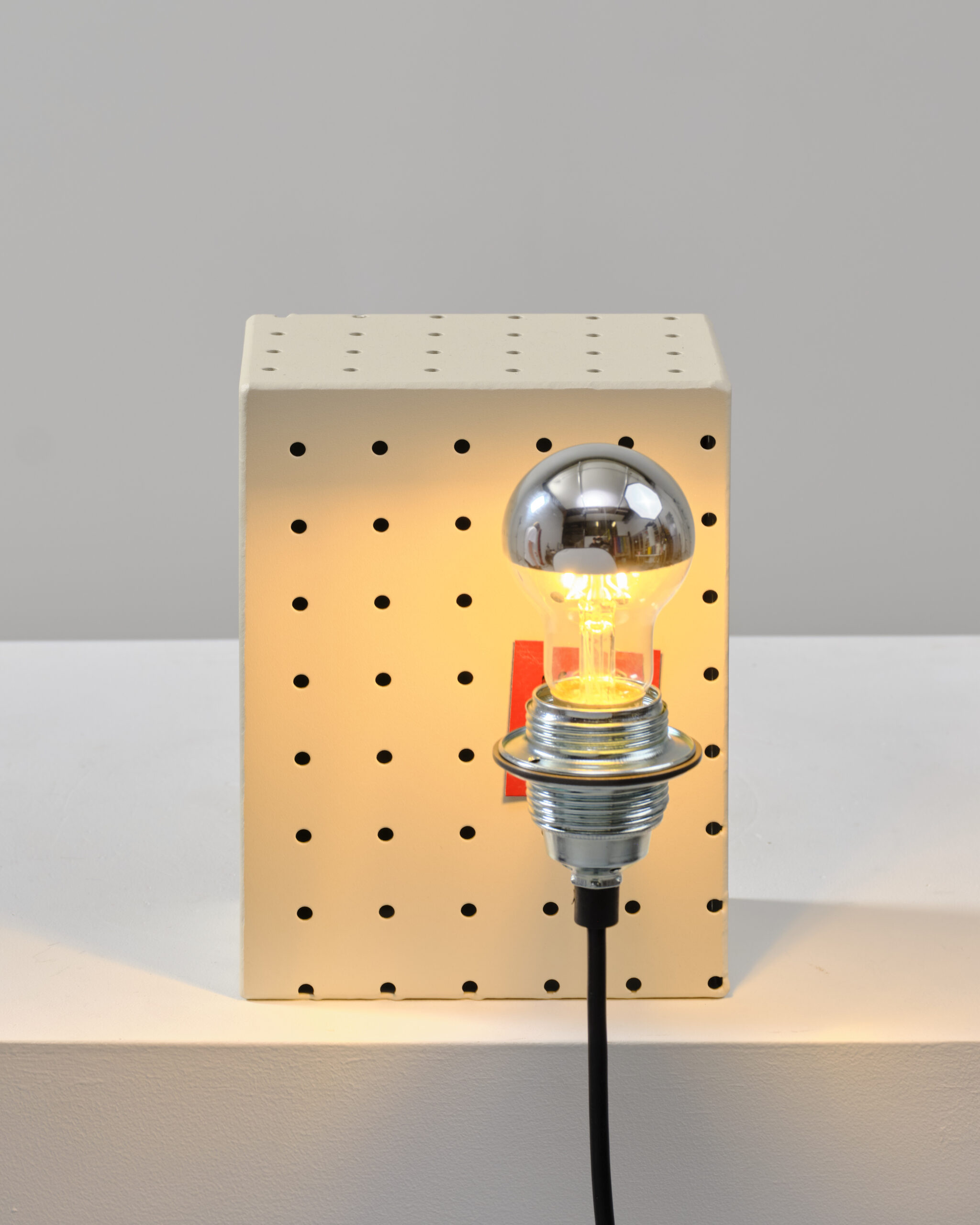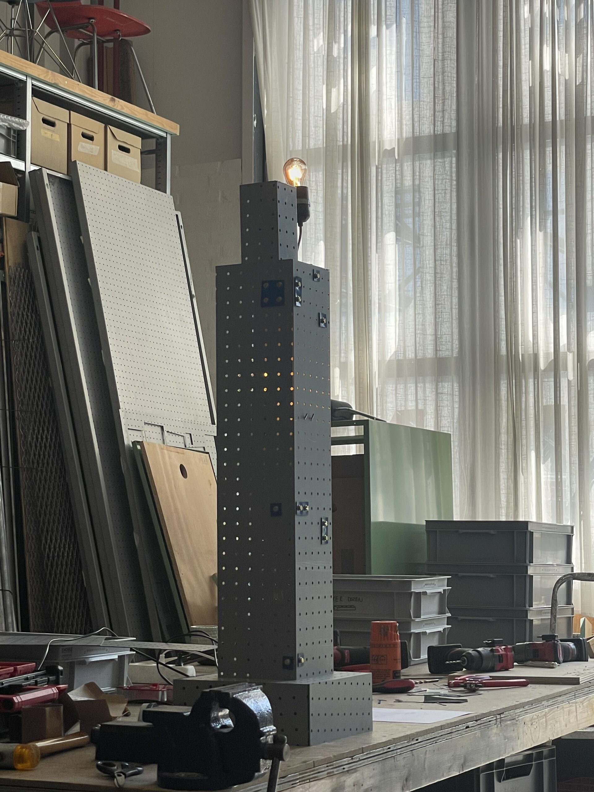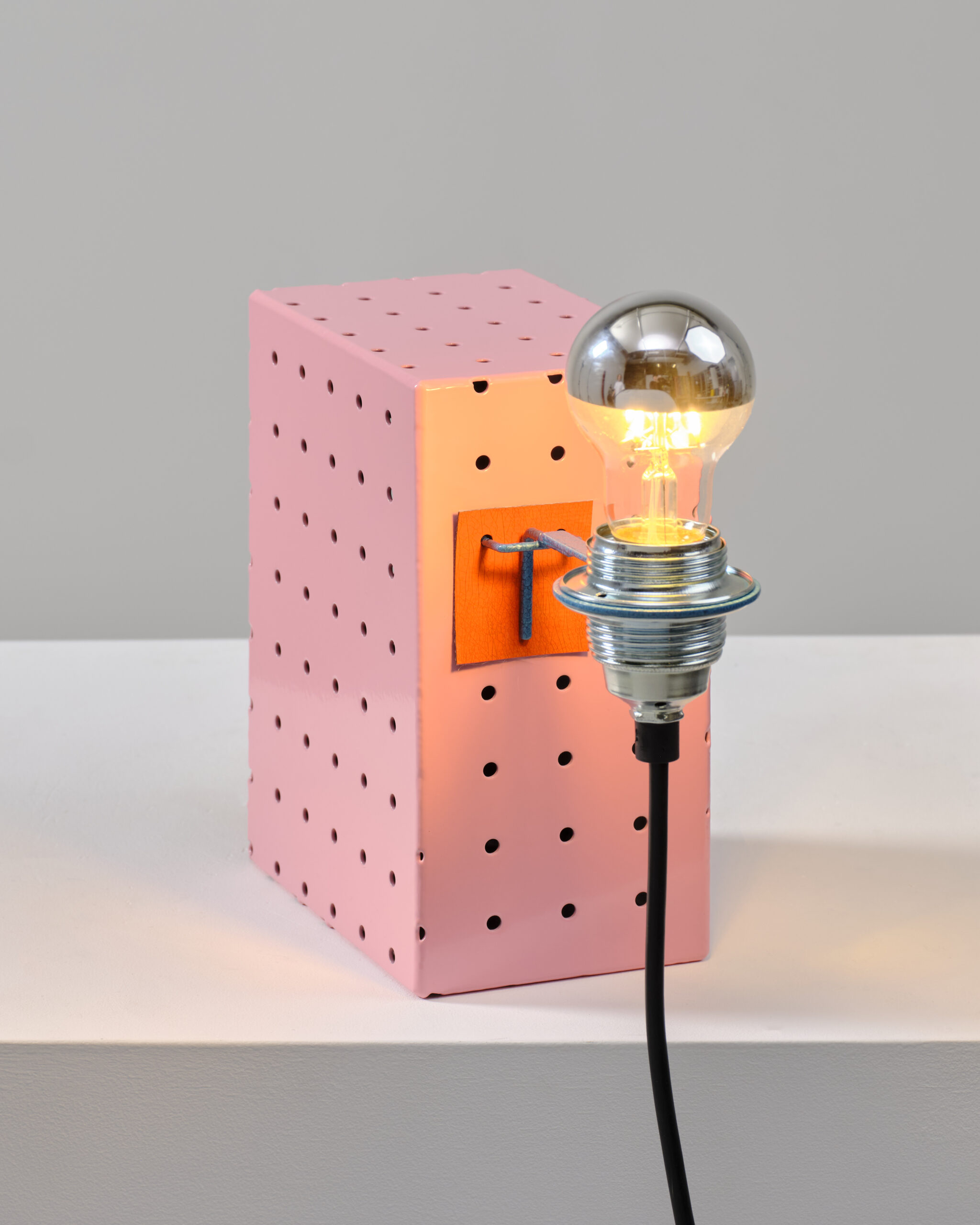 Van den Berg reused pegboards, hooks, and other elements from FREITAG Stores to create table, pendant, and floor lamps. Each design features bright truck tarp offcuts—the same recycled material used in FREITAG’s iconic bags. The collection also includes “Truck Crash” wall artworks, made by flattening toy trucks with a hydraulic press. The process references Van den Berg’s earlier Car Crash series and celebrates the brand’s roots in road materials.