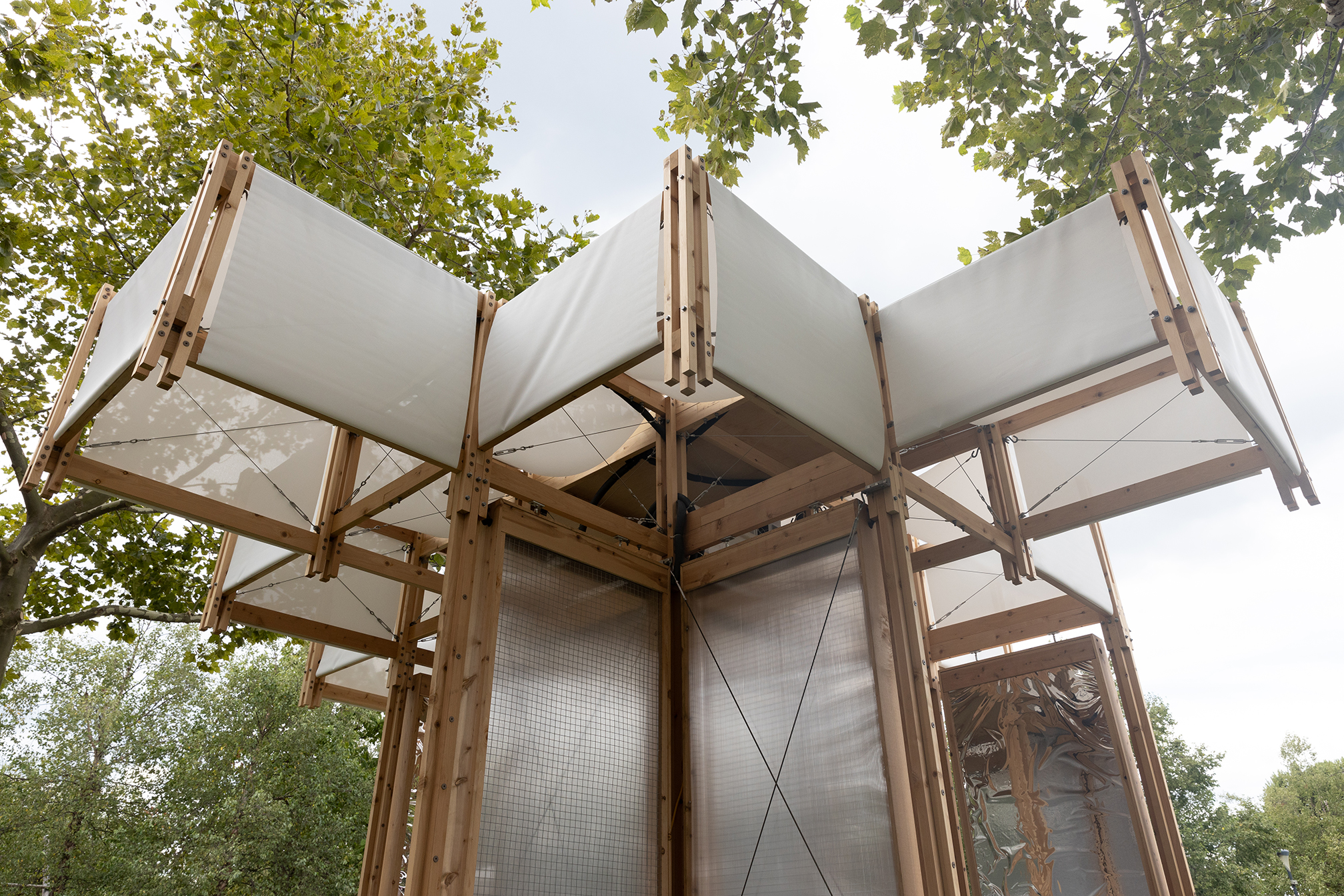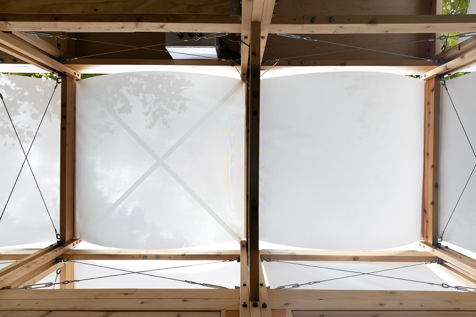 The pavilion works with radiant cooling panels. Water circulates through microtubes inside transparent panels, drawing heat directly from the human body. At the same time, fabric shading lowers heat exposure and lets natural breezes pass through. The system stays effective even in humid summer conditions, thanks to a thin membrane that prevents condensation.