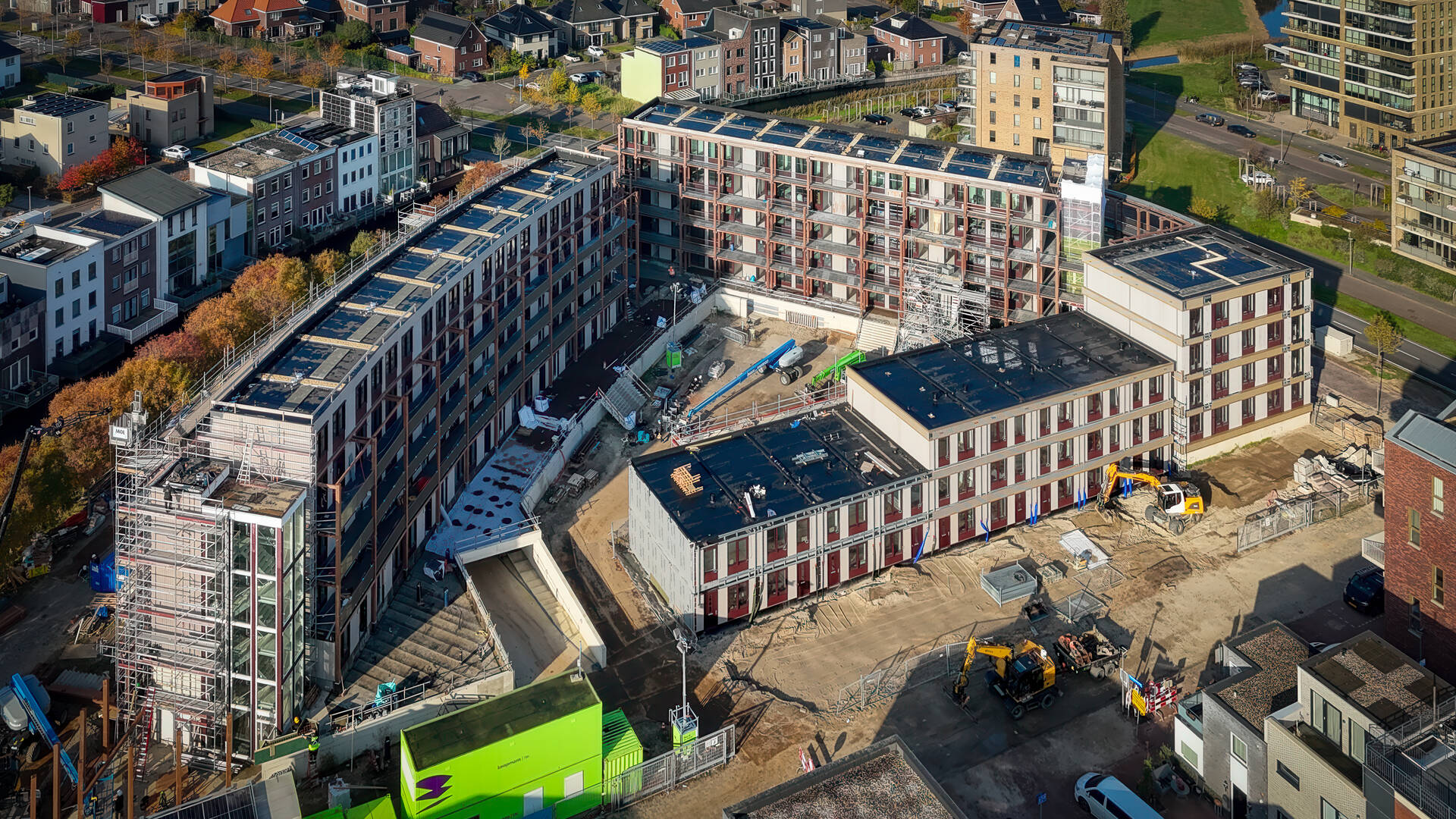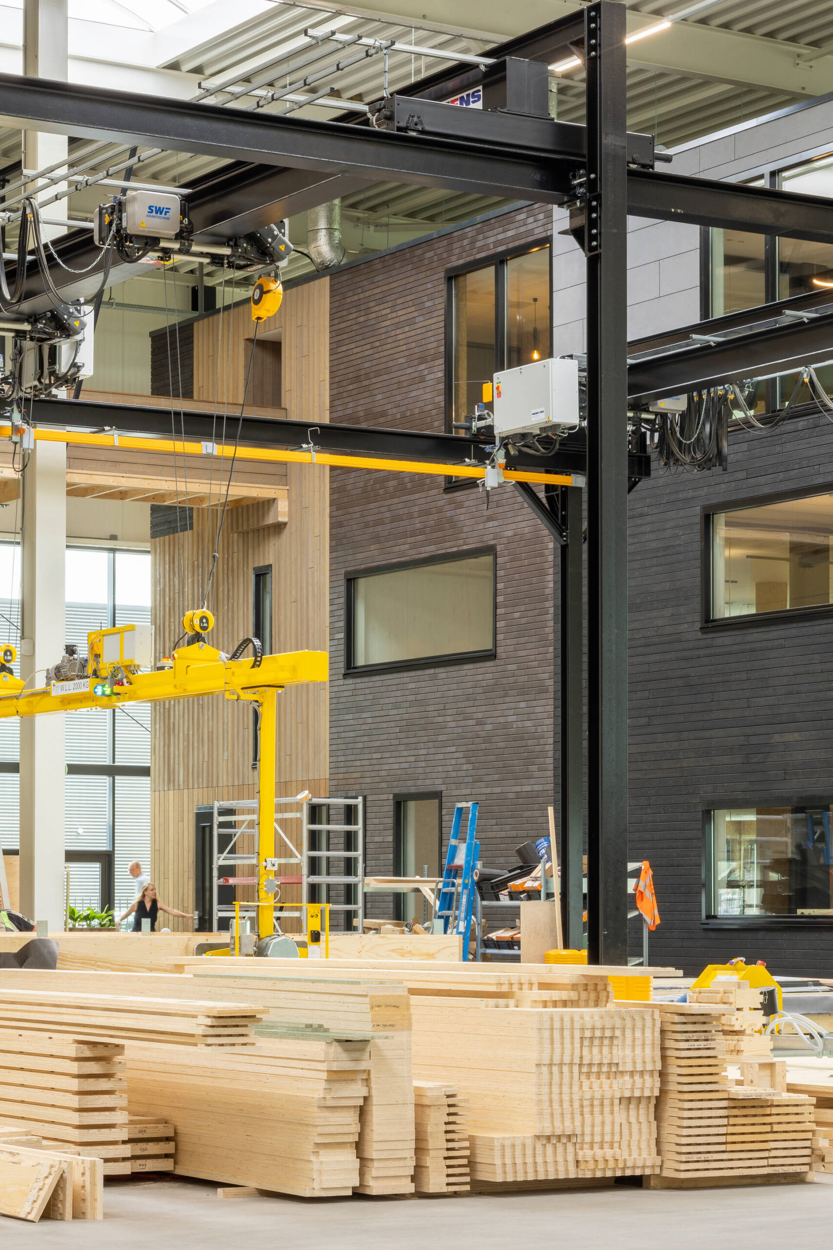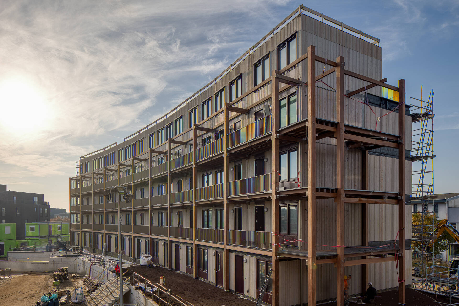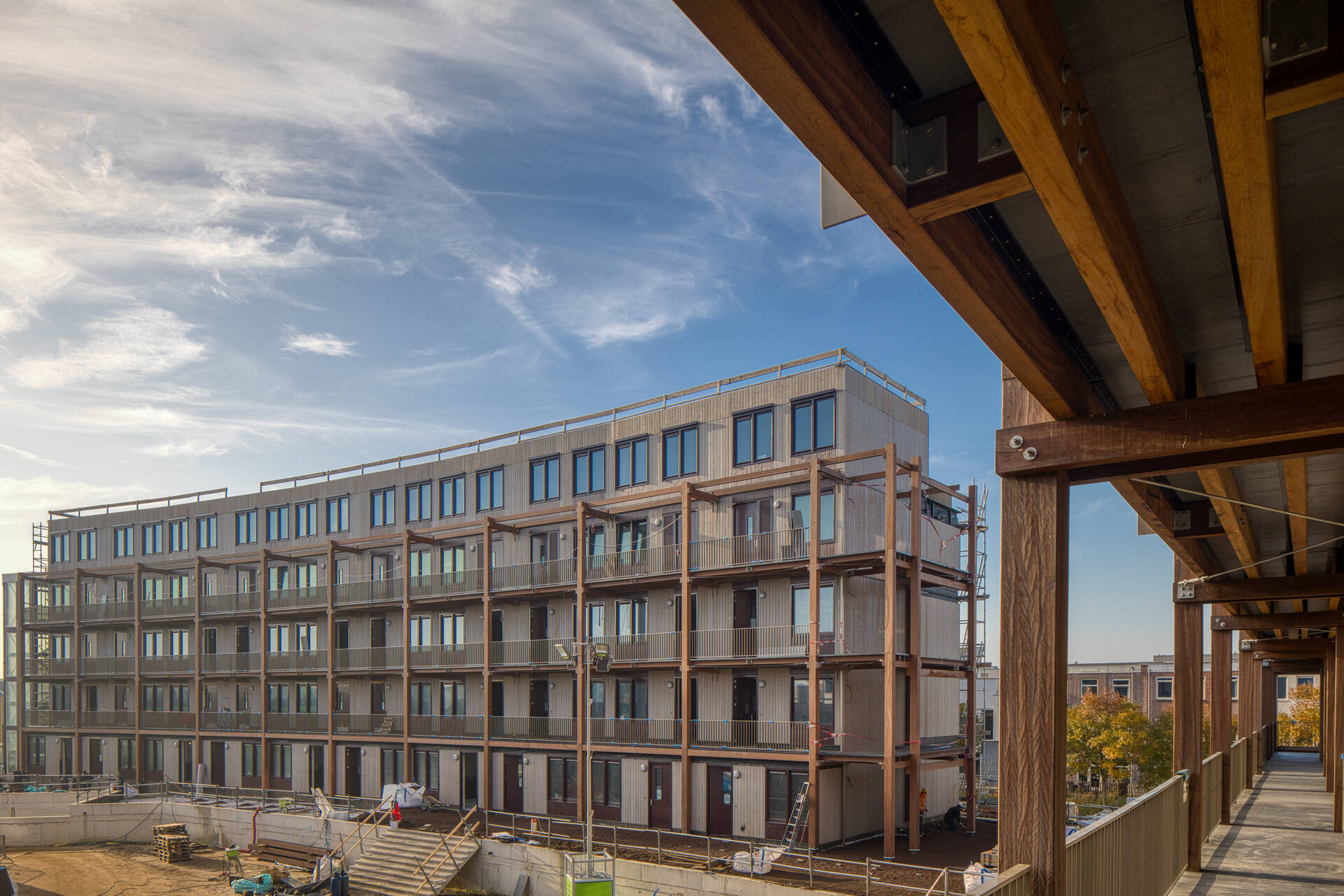 The building consists of 436 prefabricated timber modules, produced off-site by Dutch timber builder geWOONhout. Each module arrives on site with integrated technical systems already installed.