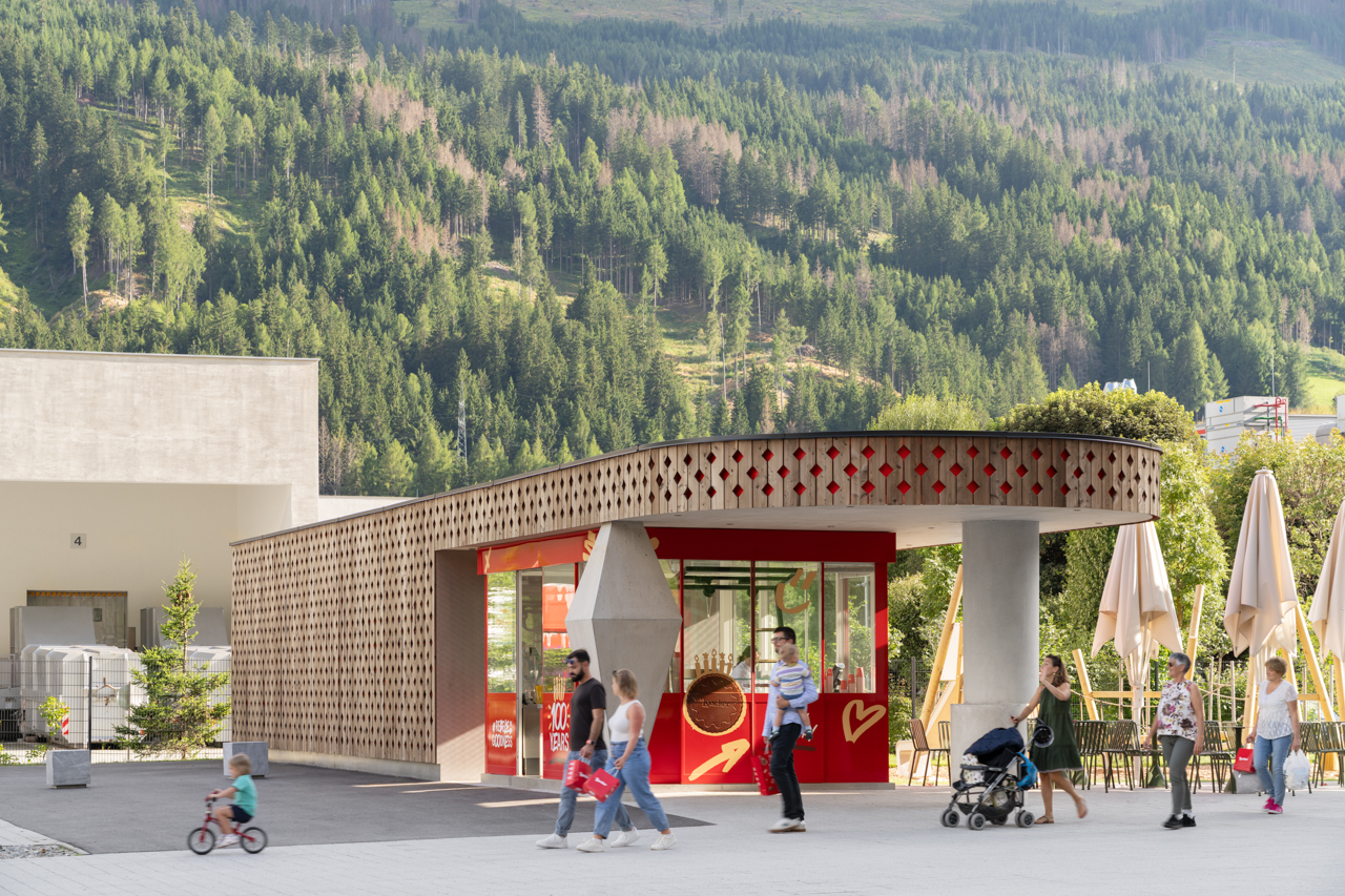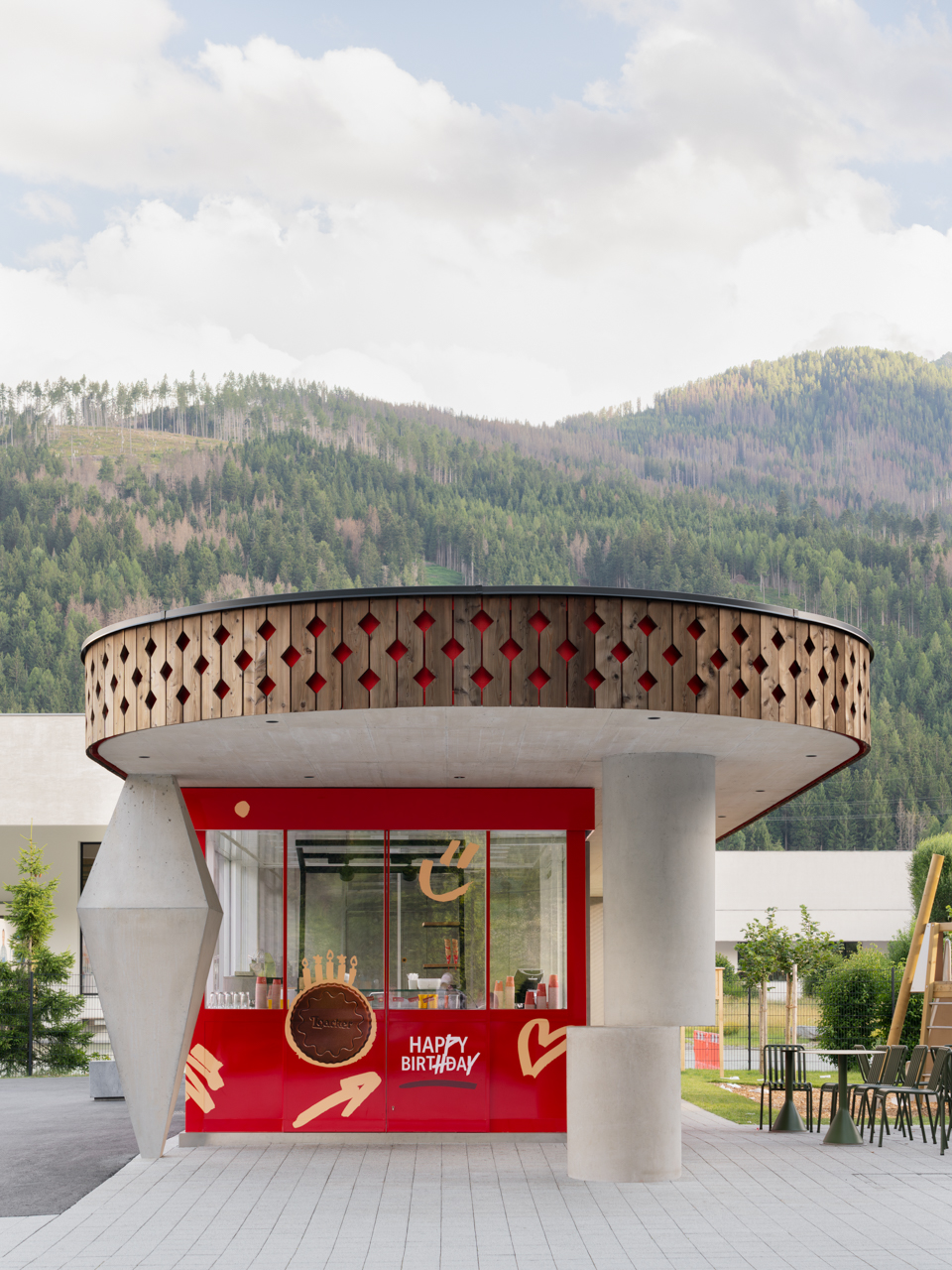 To celebrate 100 years of its hazelnut wafer, Loacker asked MoDusArchitects to redesign its flagship store in Heinfels, Austria. The project, called Loacker Galaxy, is guided by the dialogue between two key materials—wood and stainless steel. Wood refers to the company’s artisanal tradition, while steel highlights the precision of its modern production. Together, they give the flagship a clear material identity. The transformation covers the ground-floor café and shop, the first-floor pastry workshop, and a new outdoor pavilion with gardens and play areas.