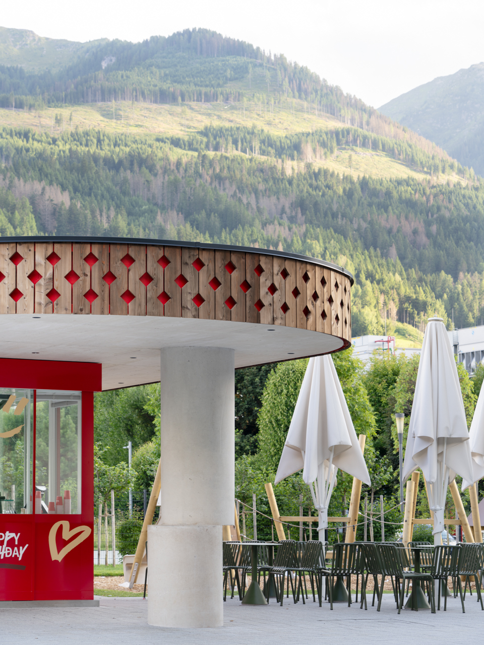 The new outdoor pavilion extends the design language to the exterior. It is clad in dark-stained timber boards with stainless-steel details. In addition, two sculptural concrete columns support the canopy, which shelters an ice cream kiosk and seasonal facilities. The surrounding “Hazelnut Garden” and children’s play area connect the design to the landscape and encourage outdoor use.