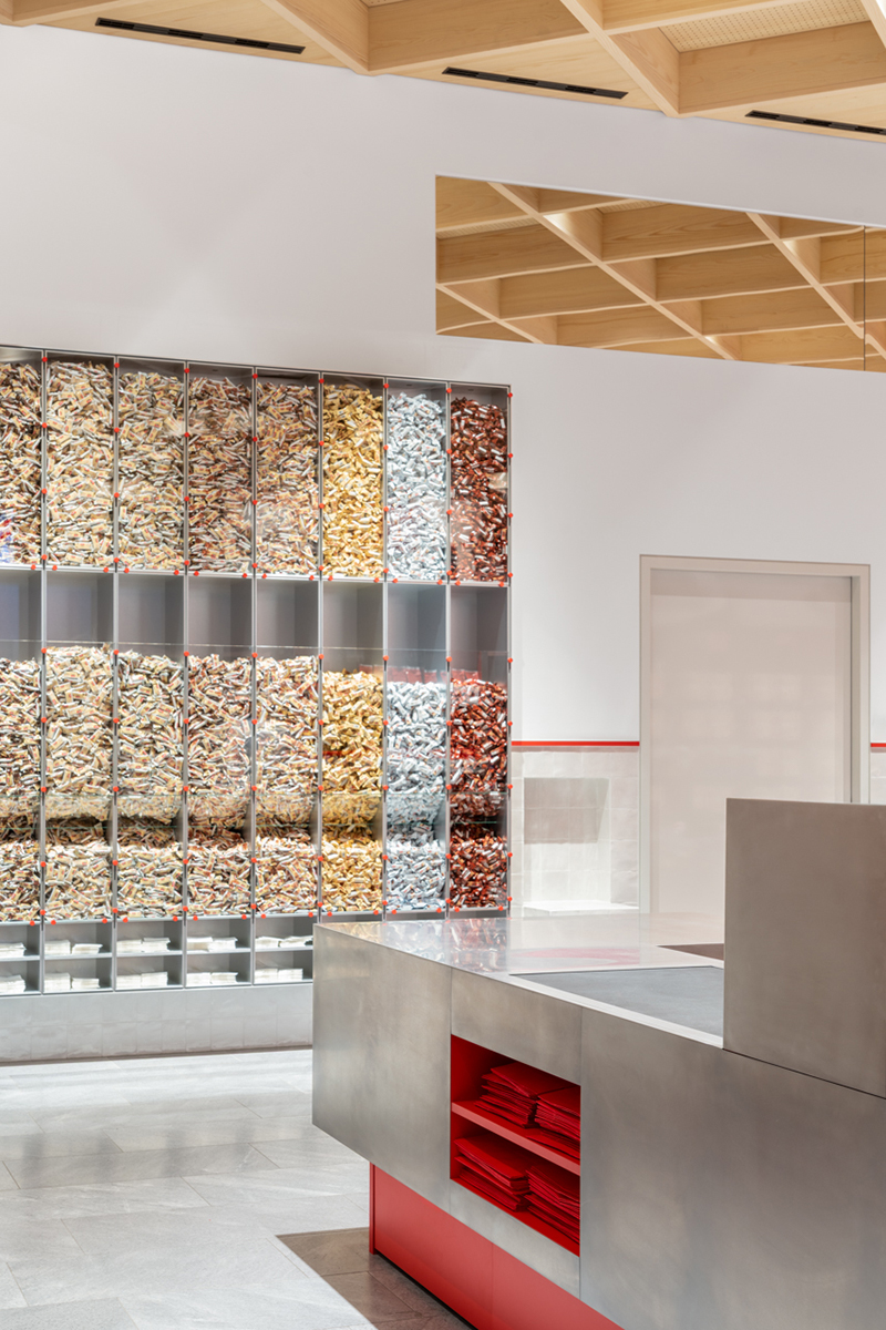 The shop is organised around ten stainless steel display totems. Each oversized shelving grid can rotate freely, which allows for flexible layouts and adds movement to the space. As a result, the displays amplify both the sense of scale and the feeling of abundance. Behind them, a pick & mix wall makes use of colour and variety to create a strong visual effect.
