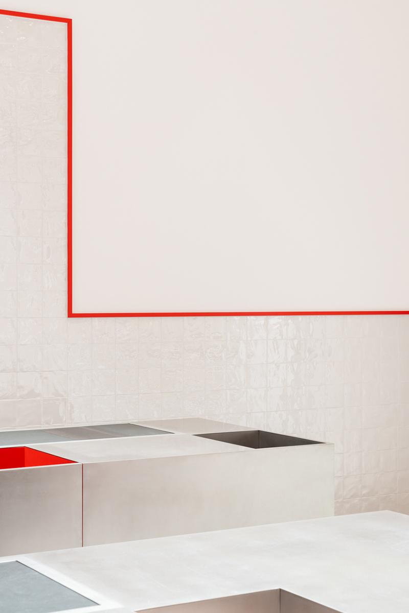 On the ground floor, the café and shop are unified by a coffered wooden ceiling. Its design is inspired by the brand’s wafer pattern and set against the stone flooring. At the entrance, a sculptural stainless steel counter introduces the contrast between warm and cool materials. This balance continues throughout the shop, where large steel furniture pieces combine with wood to define the interior.
