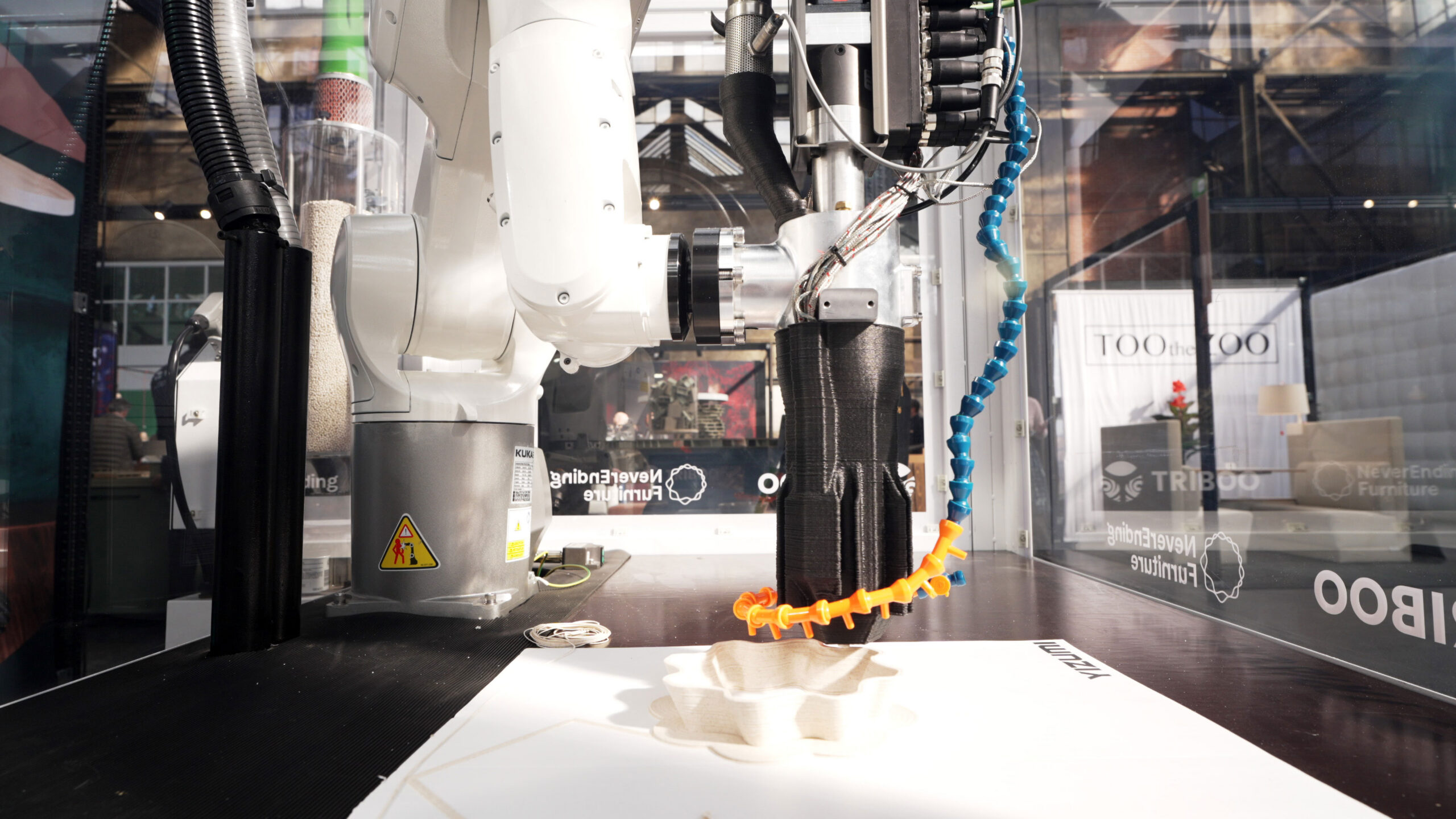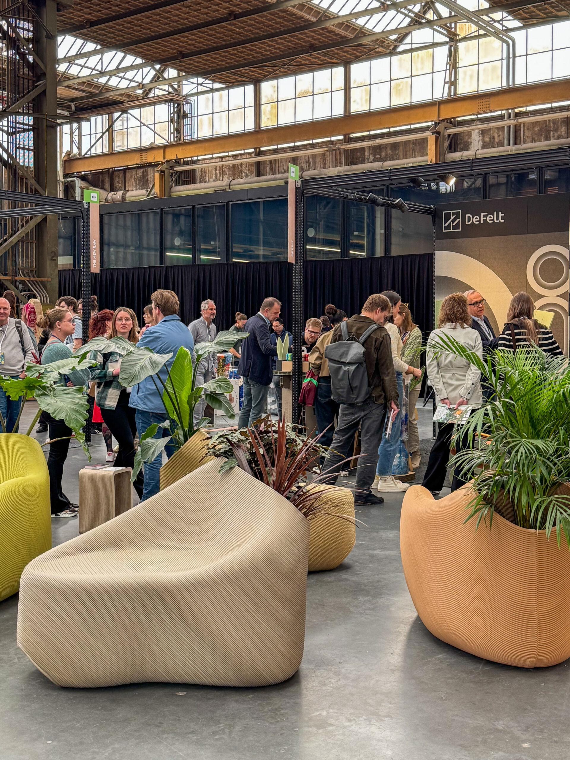 One of the most eye-catching elements of MaterialDistrict Utrecht 2026 is the live 3D furniture production on the exhibition floor. TRIBOO, in collaboration with technology partner YIZUMI, demonstrates how industrial 3D printing technology can be used for circular furniture production.