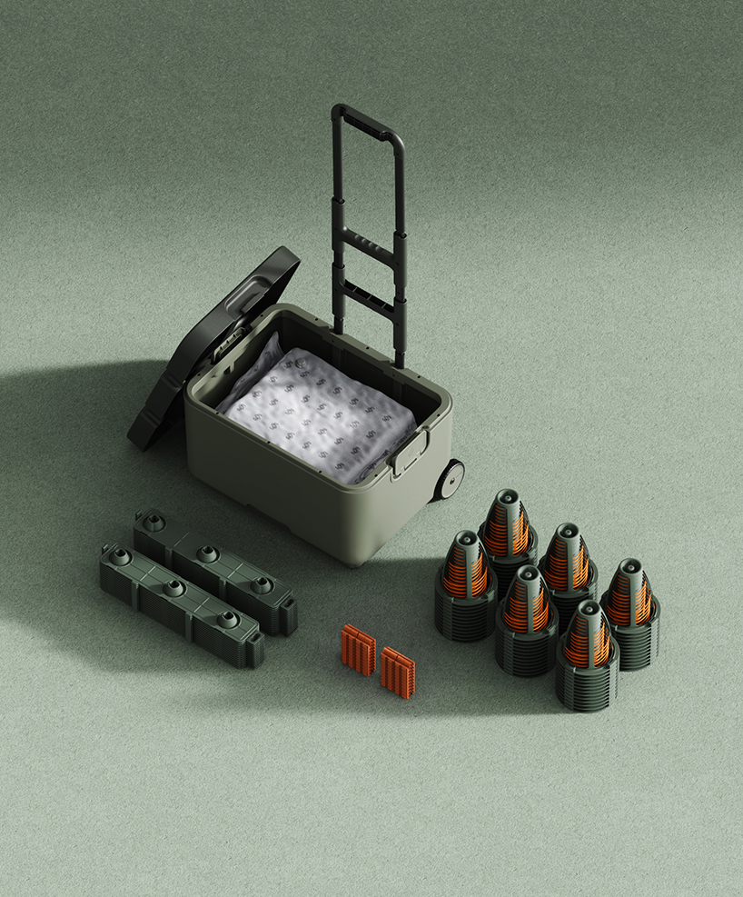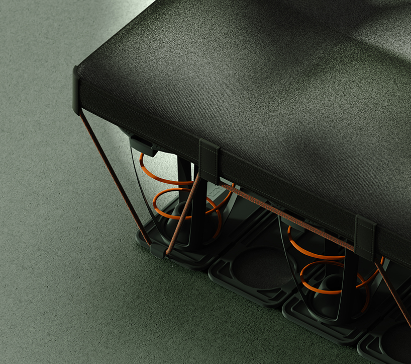 The mattress includes 72 elastic spring units. Each spring adapts to the body’s contours, while a slim topper creates a level surface. Snap-fit connectors and paracord lashings allow for quick assembly. The structure remains visible, and the colour palette combines natural tones with bright accents, referencing outdoor gear.