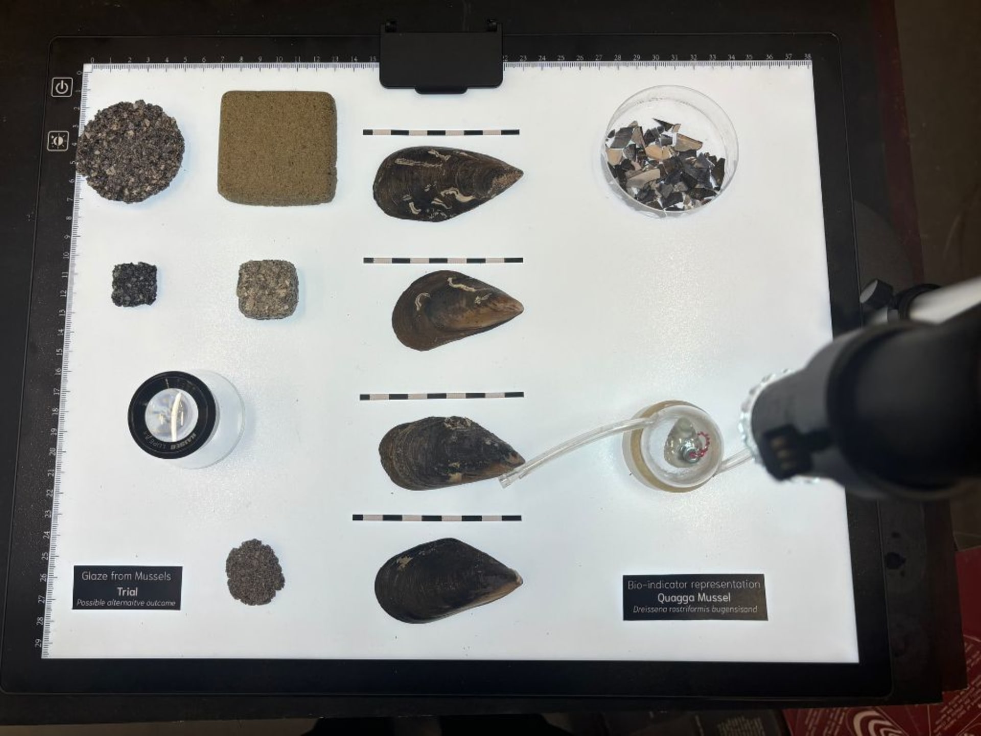 At the heart of the project is a regenerative material system that repurposes shell waste from invasive mussels. These shells are collected through collaborations with local researchers, initiatives and restaurants. Instead of becoming waste, they are transformed into a biodegradable composite material.