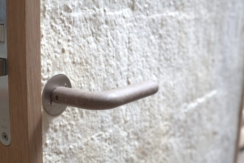 The prototype includes a door handle made from recycled seashells. Architect Bjarne Hammer designed it for Danish hardware brand Randi. The material creates a smooth yet tactile surface. It shows how natural and waste-based materials can work together in high-quality products.