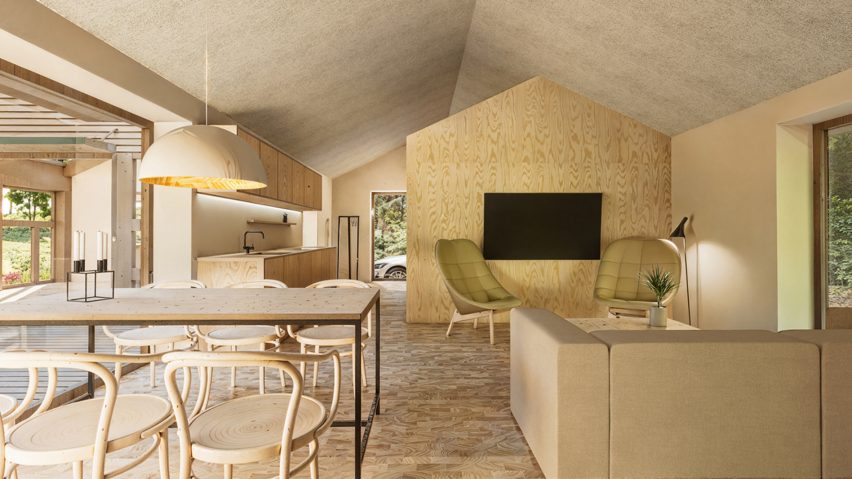 A timber frame surrounds the mycelium core. The team made it from reclaimed and surplus wood, including offcuts from Danish flooring manufacturer Dinesen. This combination of biobased and recycled materials supports a circular design approach and reduces waste.