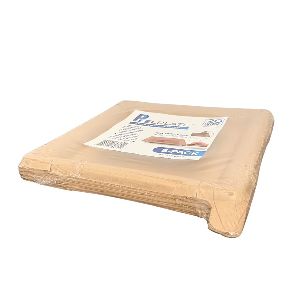 Peelware plates use unbleached, plant-based paper in a natural light-brown colour. The material contains no plastics, PFAS (“forever chemicals”), dyes, or bleaching agents. Each item includes up to twenty compacted layers. After a meal, users simply peel away the top layer to reveal a clean surface. This process extends the lifespan of each plate and reduces material use by up to a factor of ten compared with standard disposable products. A thick bottom layer gives the product strength, so the final layer remains stable and usable.