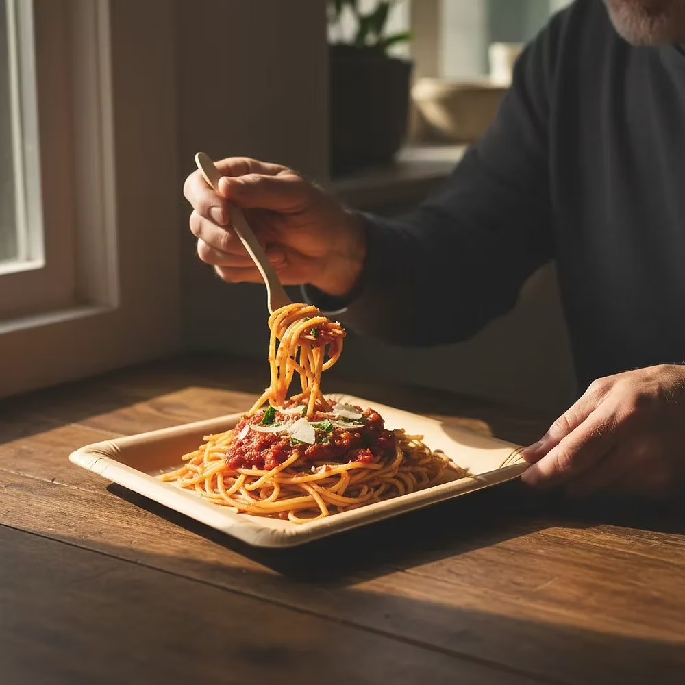 Peelware adds several design details to improve hygiene. The folded edges protect the unused layers, while the hydrophobic paper allows brief rinsing if needed. The compact structure offers strong cut-resistance, except when using serrated or very sharp knives. The plates also heat food efficiently in the microwave without overheating themselves, which makes them suitable for quick-service environments.