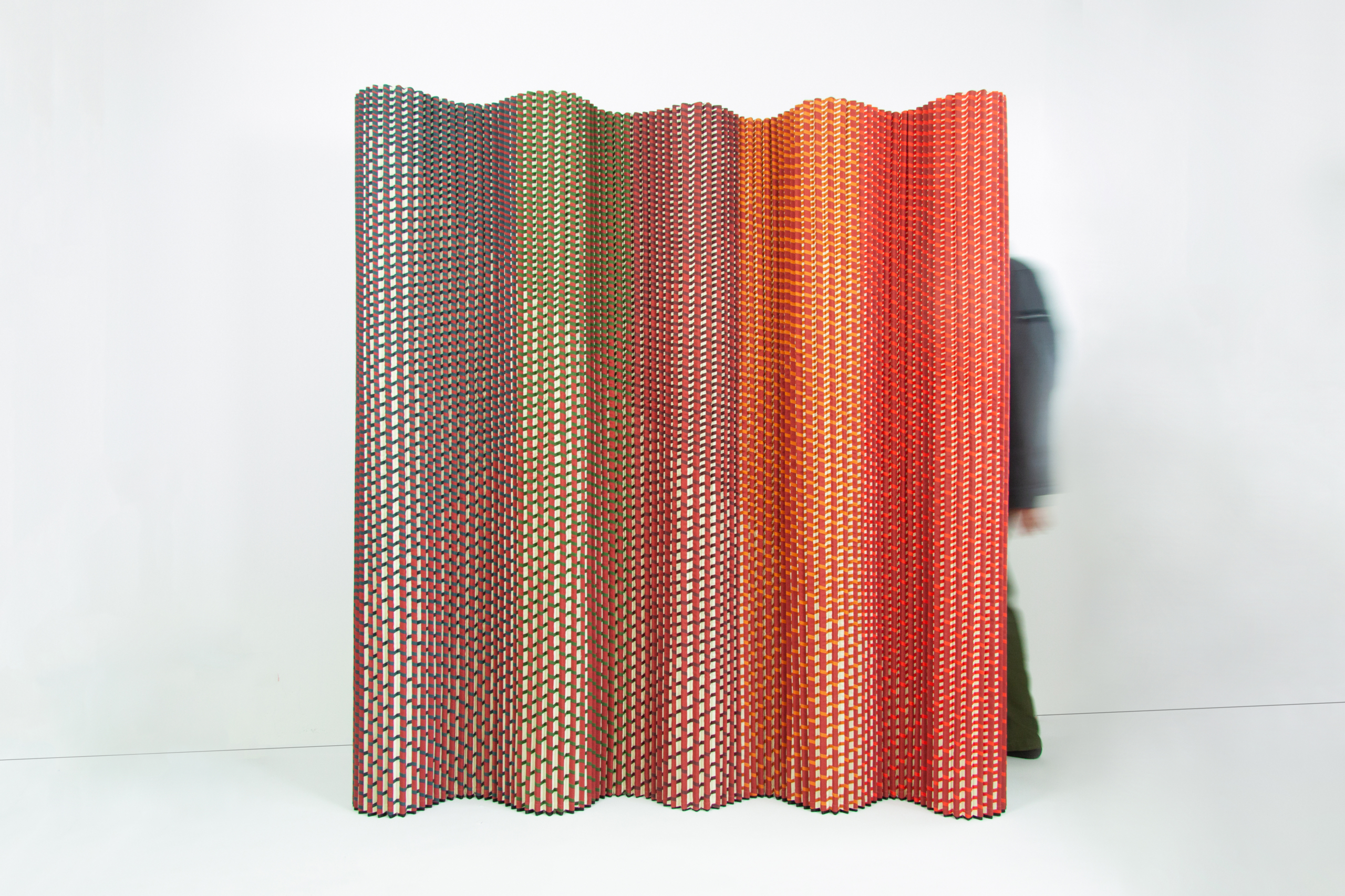 Plissade is designed to be foldable, modular and rollable, characteristics that make it adaptable for residential, commercial and exhibition contexts. It can be used to create temporary partitions, guide circulation or introduce colour and texture into a space without the permanence of built structures.