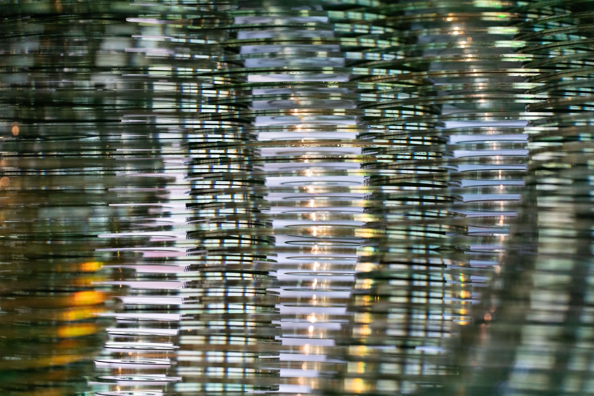 The exhibition Stratagems by US-based artist Tara Donovan explores how large quantities of identical waste materials can form new spatial systems. The works consist entirely of thousands of discarded compact discs, a post-consumer plastic product that has largely lost its original function.