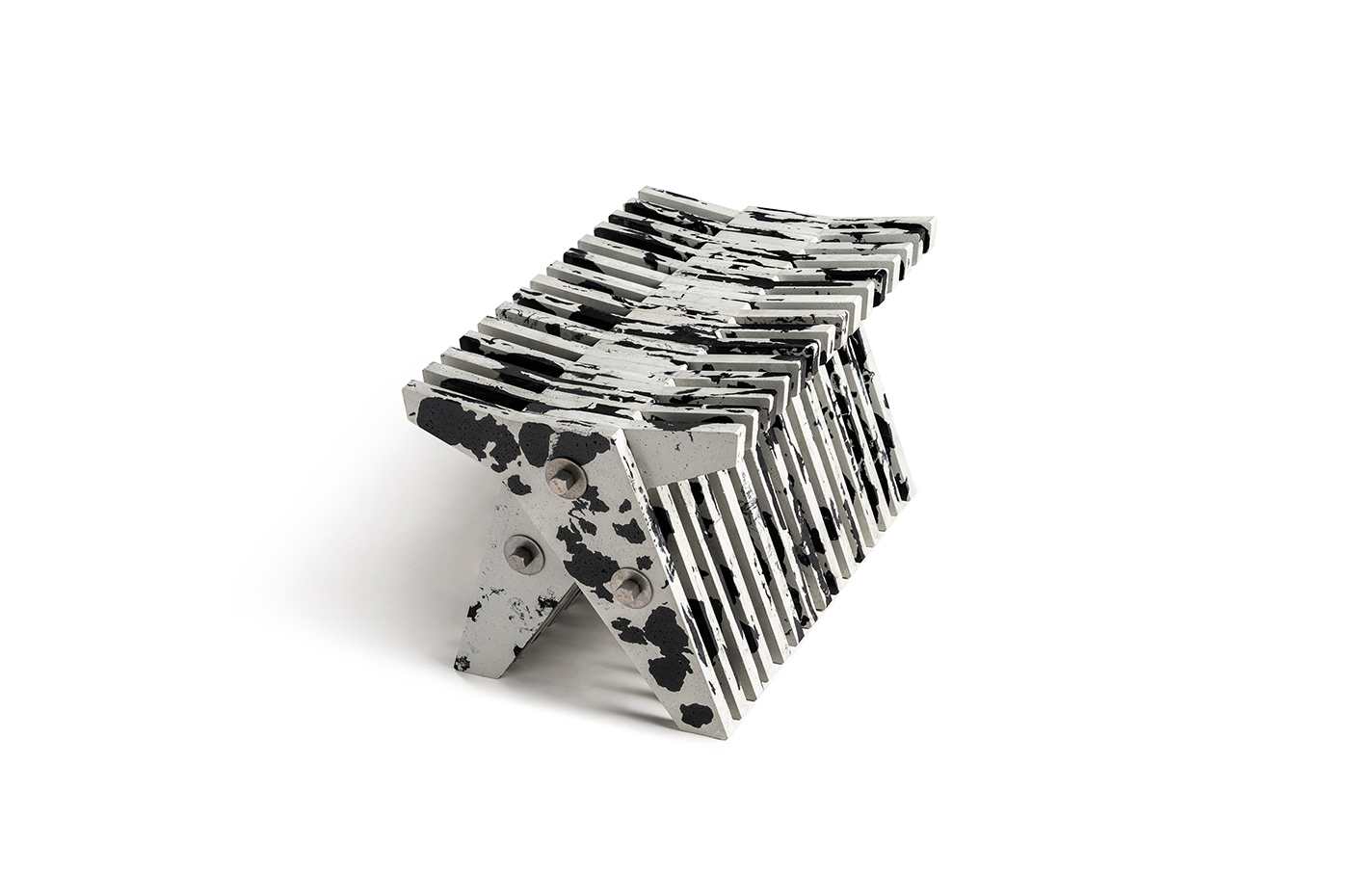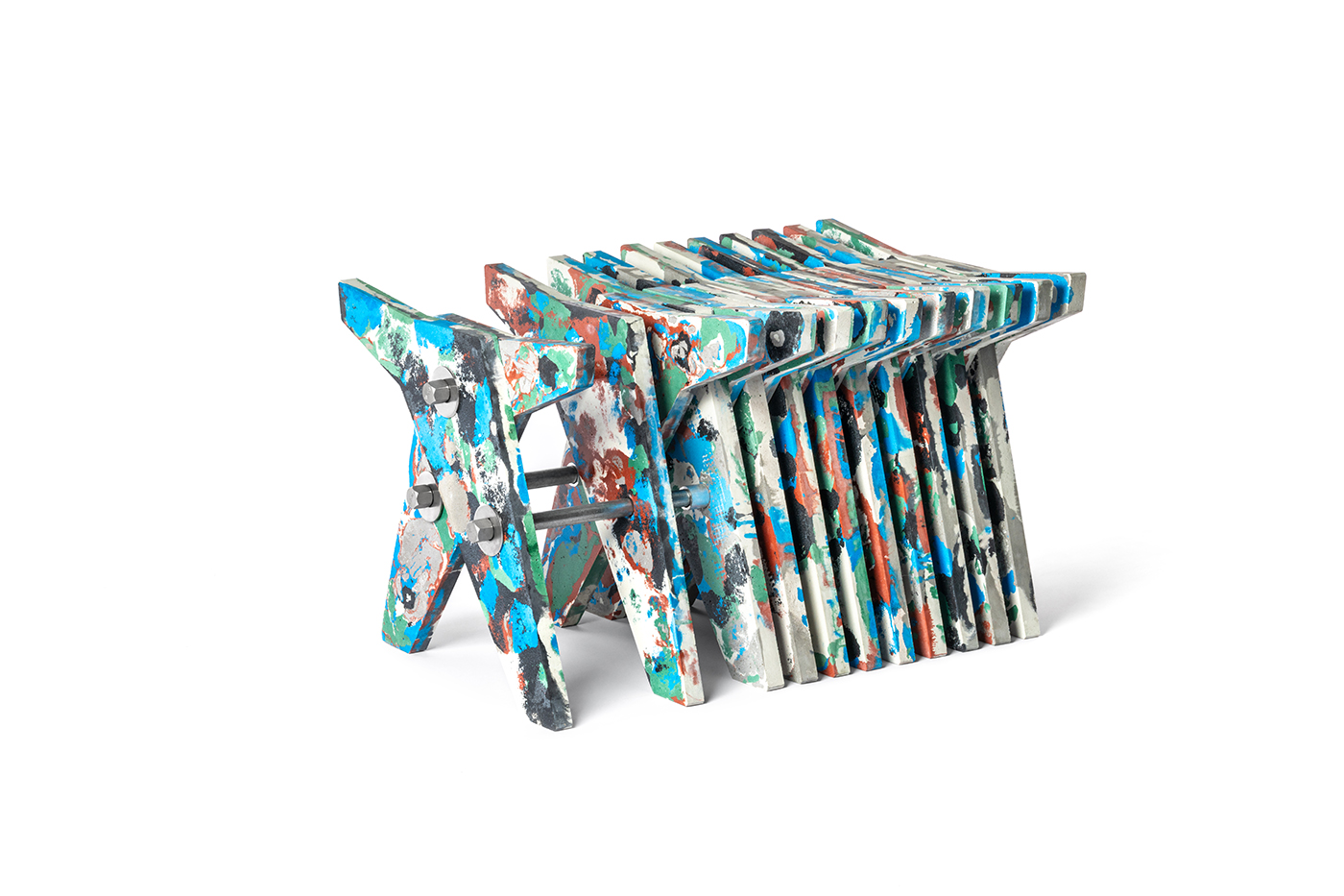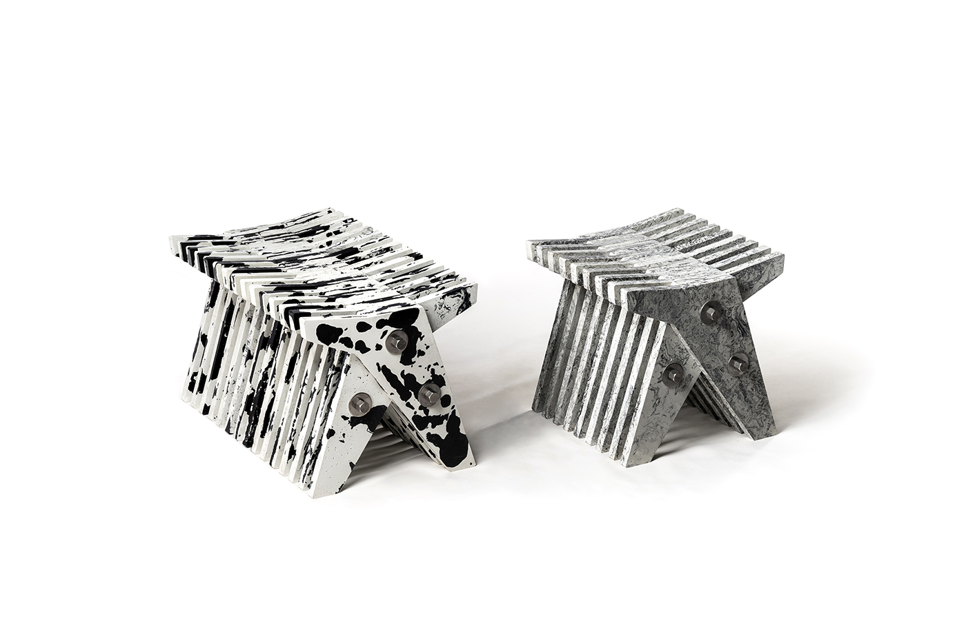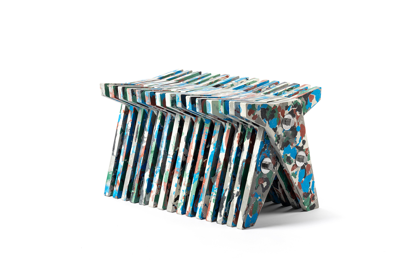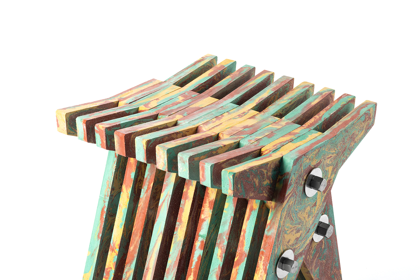 The ‘X’ stool is designed for outdoor and public environments. Its weight and strength make it suitable for urban landscapes and architectural applications. The project shows how waste materials can meet high technical standards.