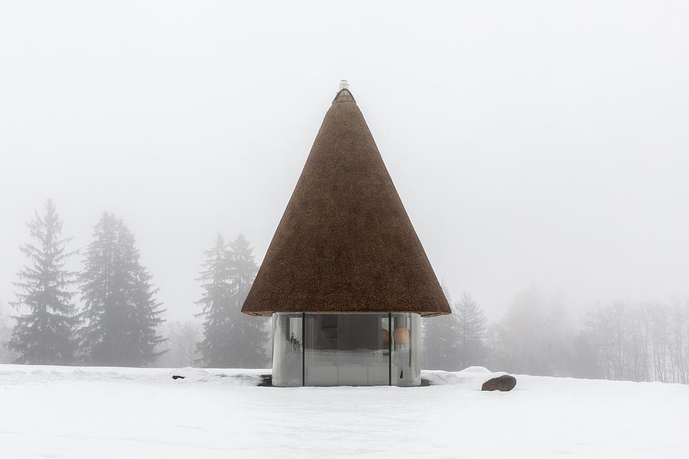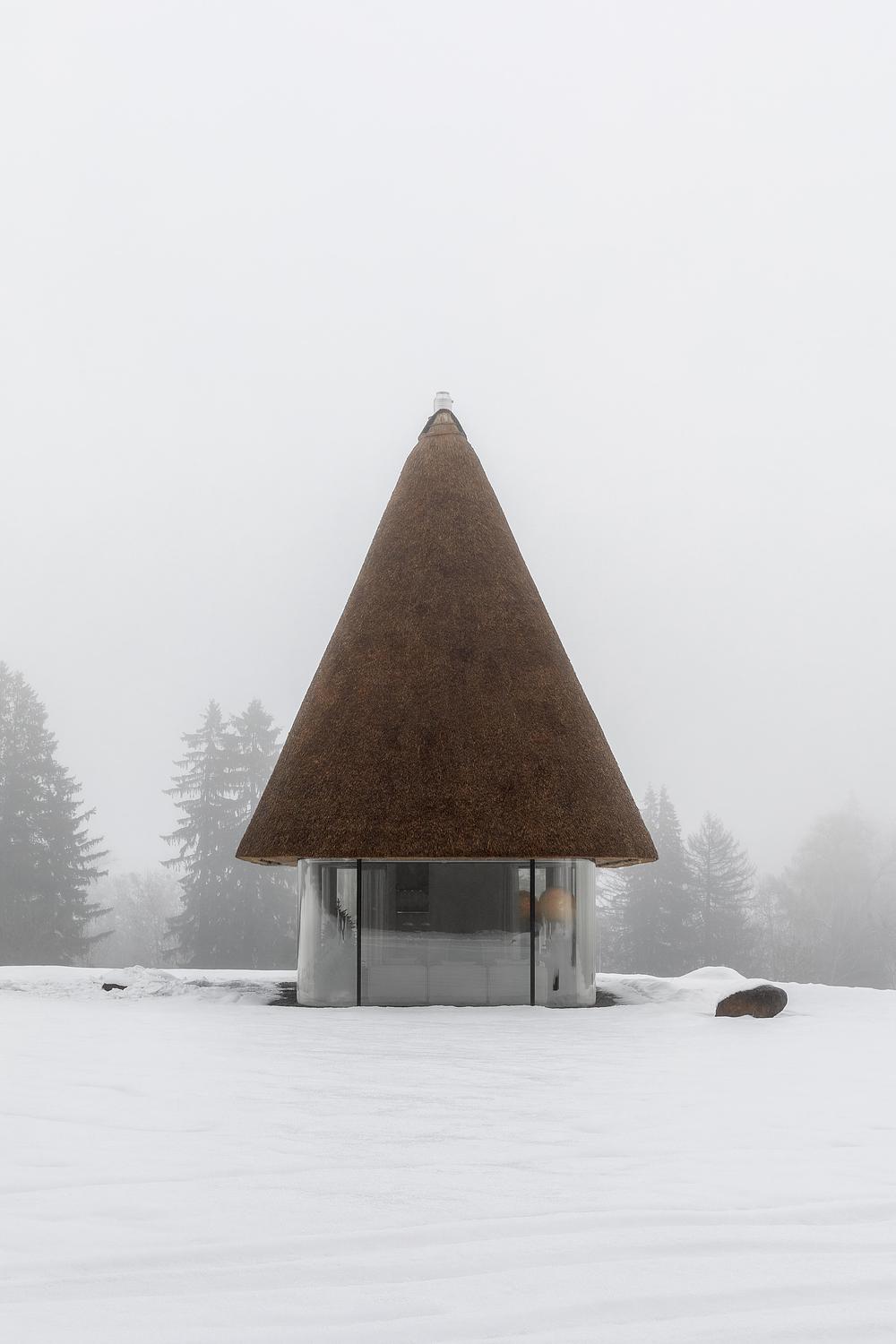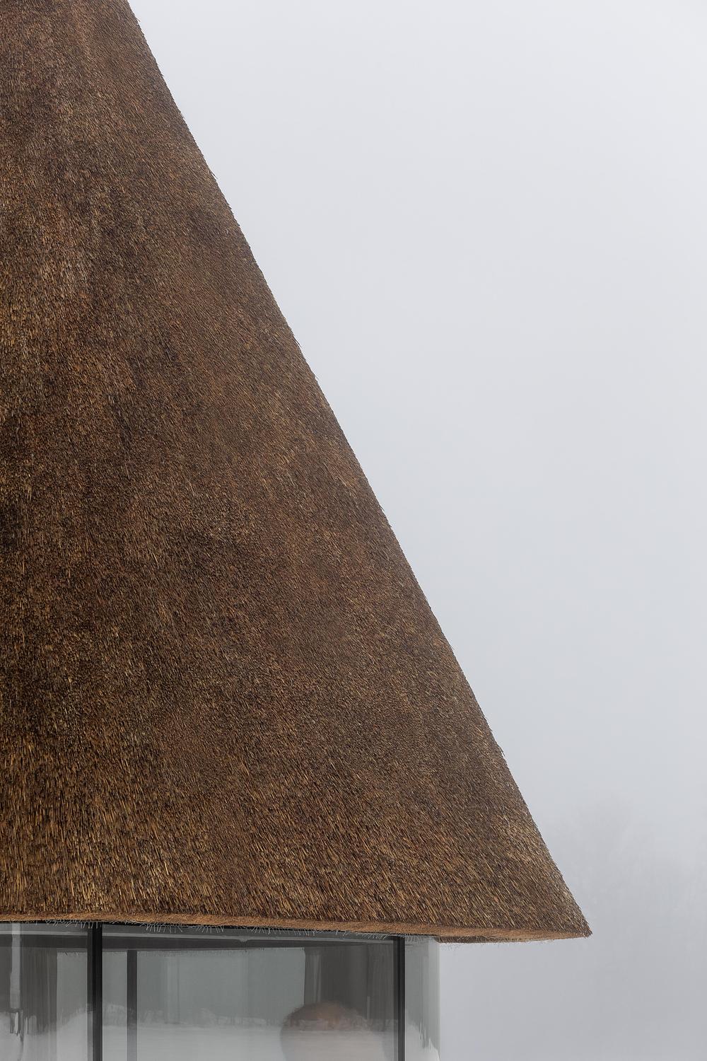 The sculptural roof recalls both a tall traditional hat and a mushroom rising from the landscape. At the same time, it highlights reed as a biobased material with natural insulating qualities. Because reed grows locally and regenerates quickly, it supports a low-impact and place-based construction approach.