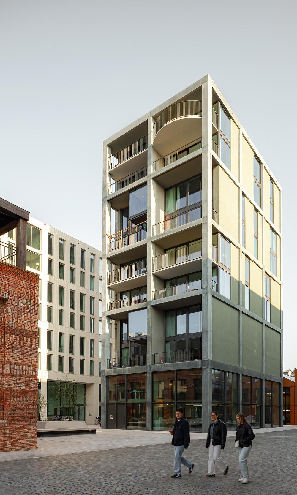 The development combines housing, offices, hospitality, leisure spaces and shared mobility within a compact footprint, with a Floor Space Index of 3.3. At the same time, the design uses a clear material strategy to differentiate functions and enable long-term flexibility. Recycled, renewable and durable materials play a key role in shaping both the architecture and the public realm.