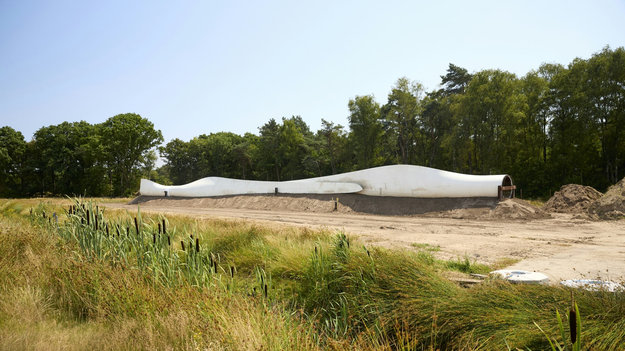 The Blade Barrier consists of two full wind turbine blades and one cut section. The structure reaches heights between 3 and 4 metres. Acoustic studies confirm that its performance matches that of a traditional concrete barrier of around 3.3 metres high.