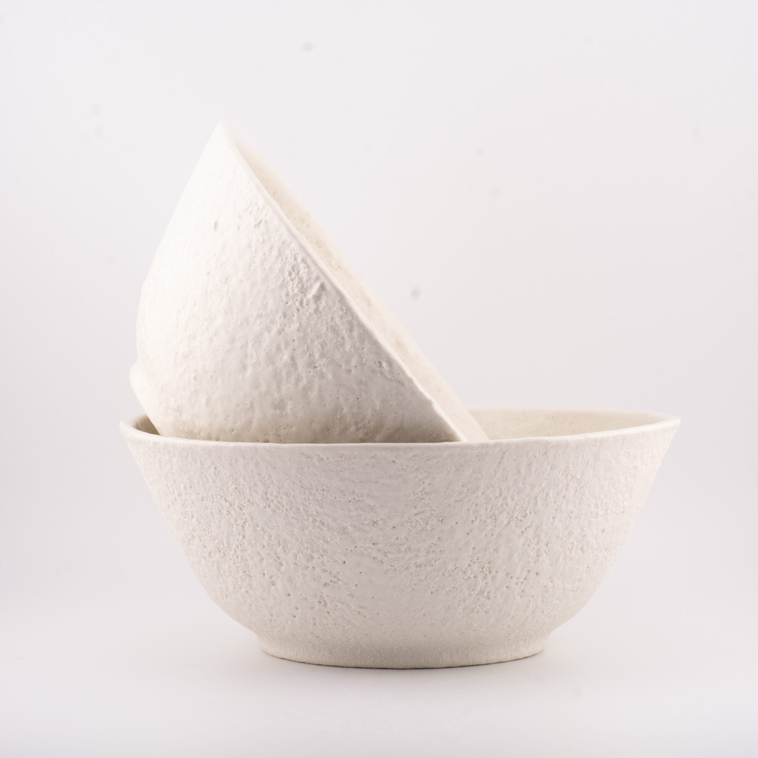 The savory bowl contrasts with a rough, unglazed exterior and a smooth, glazed interior that recalls crystallised salt. The material difference between inside and outside invites tactile engagement, encouraging users to notice the texture while eating.