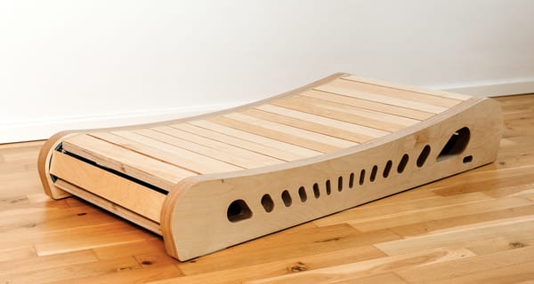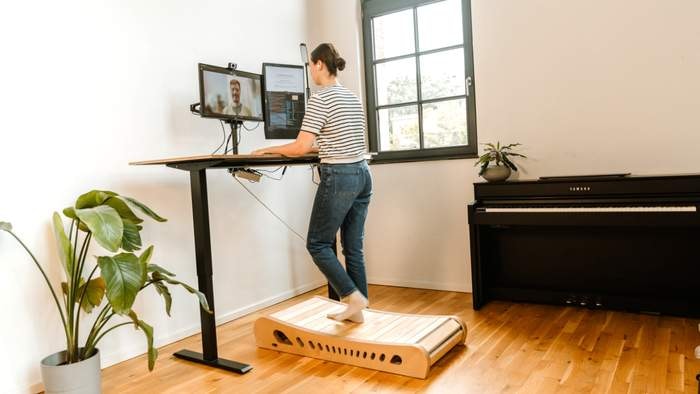 The Office Walker, created by Berlin-based designer and physicist Johannes Kettmann, introduces a new approach to movement in the workplace. Unlike electric walking pads, it works without a motor, and it is made of wood. The user’s own steps power the device, eliminating noise, electricity use, and mechanical wear. This makes it a quiet, low-maintenance alternative to conventional treadmills.