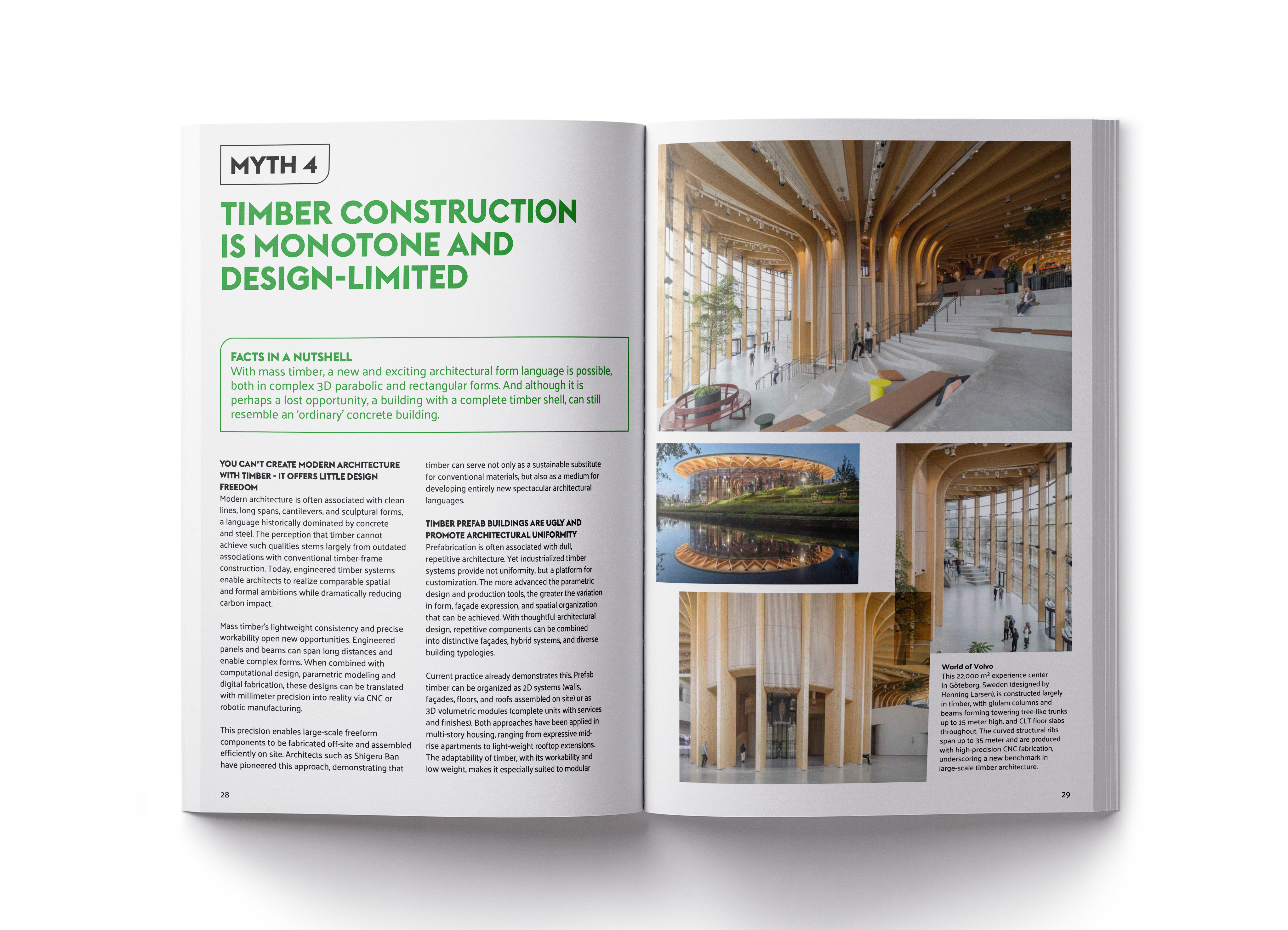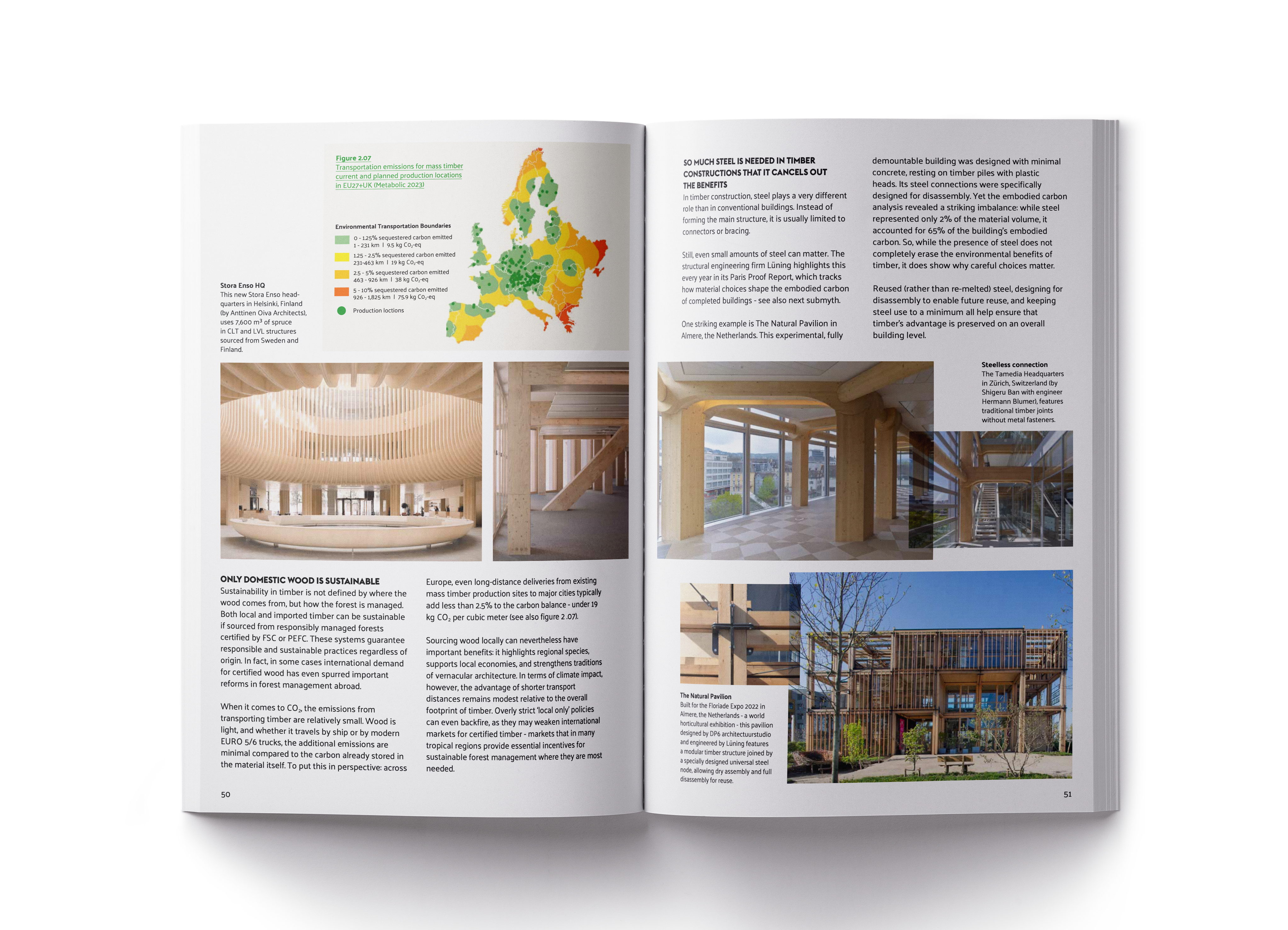The case studies – including HAUT (Netherlands), Sara Kulturhus (Sweden), Mjøstårnet (Norway), SAWA (Netherlands) and World of Volvo (Sweden) – demonstrate how timber is used worldwide at an advanced level. Together, they offer a realistic, richly illustrated and well-supported overview of the real potential of timber construction.