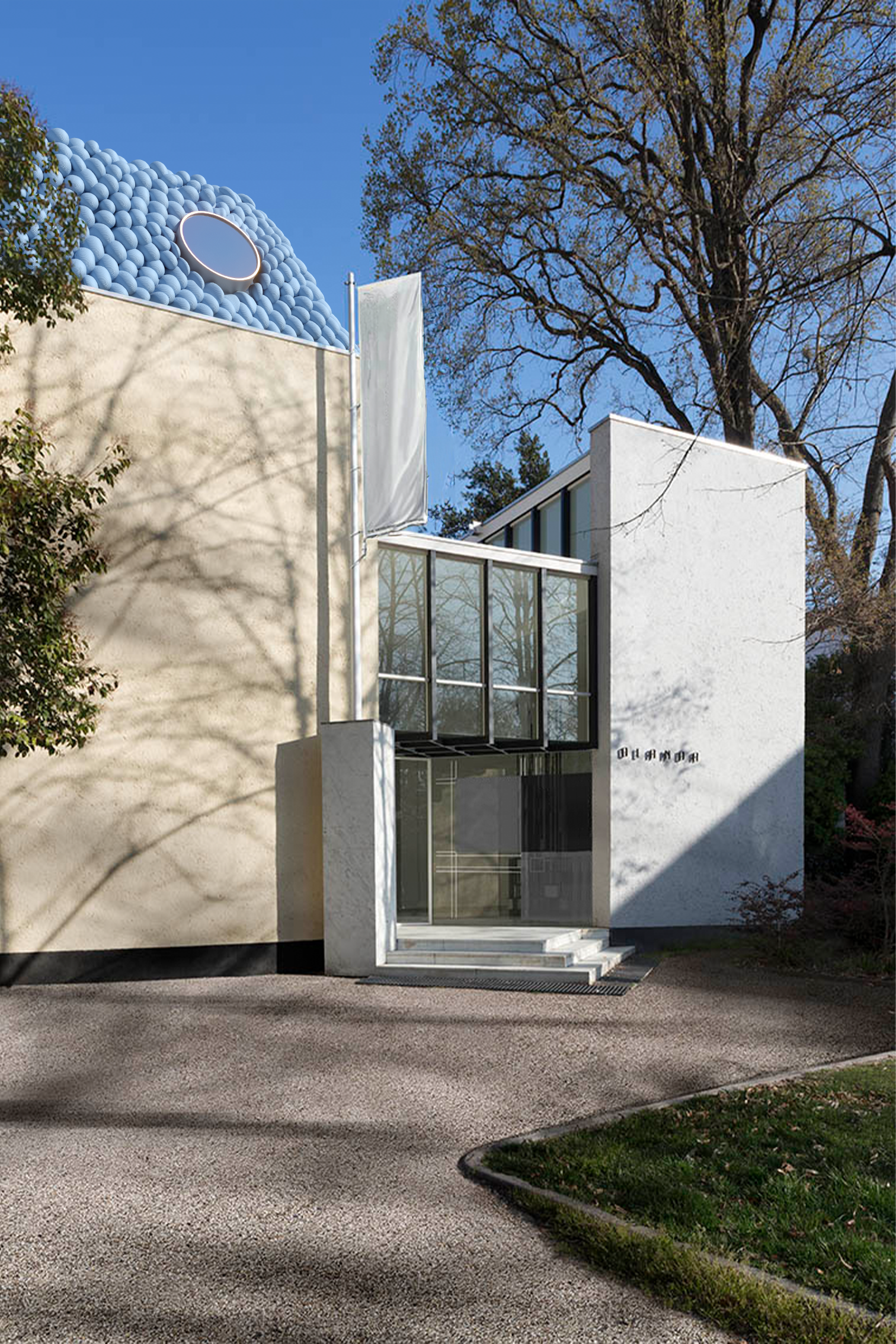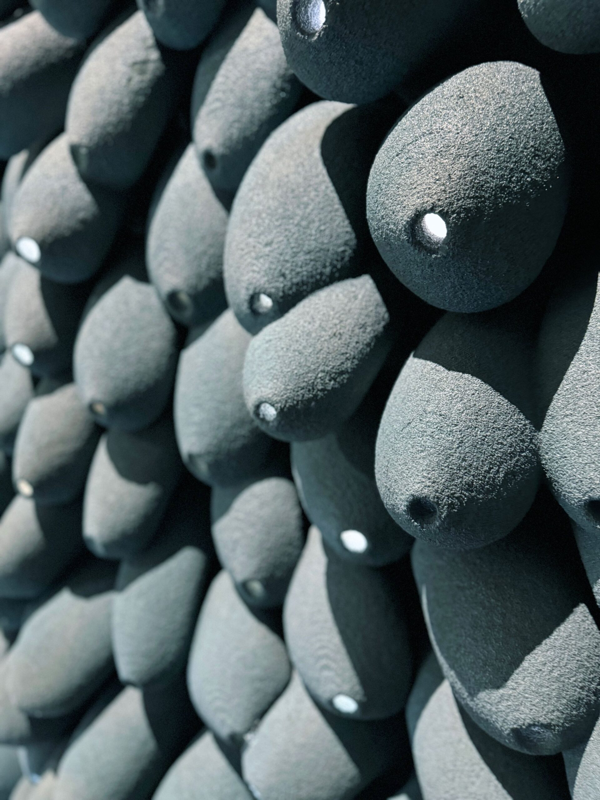 In Venice, Heinsman exhibits Tiny Penthouse 02, a proposal for student housing atop Amsterdam’s Stedelijk Museum, alongside a full-scale 3D printed wall. The sculptural wall — affectionately nicknamed the “Tette Wall” (Titty Wall) for its round, tactile forms — demonstrates how additive manufacturing can produce organic, material-efficient geometries while minimising waste.