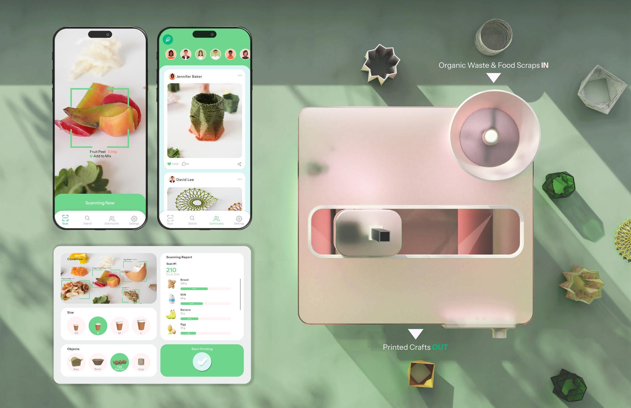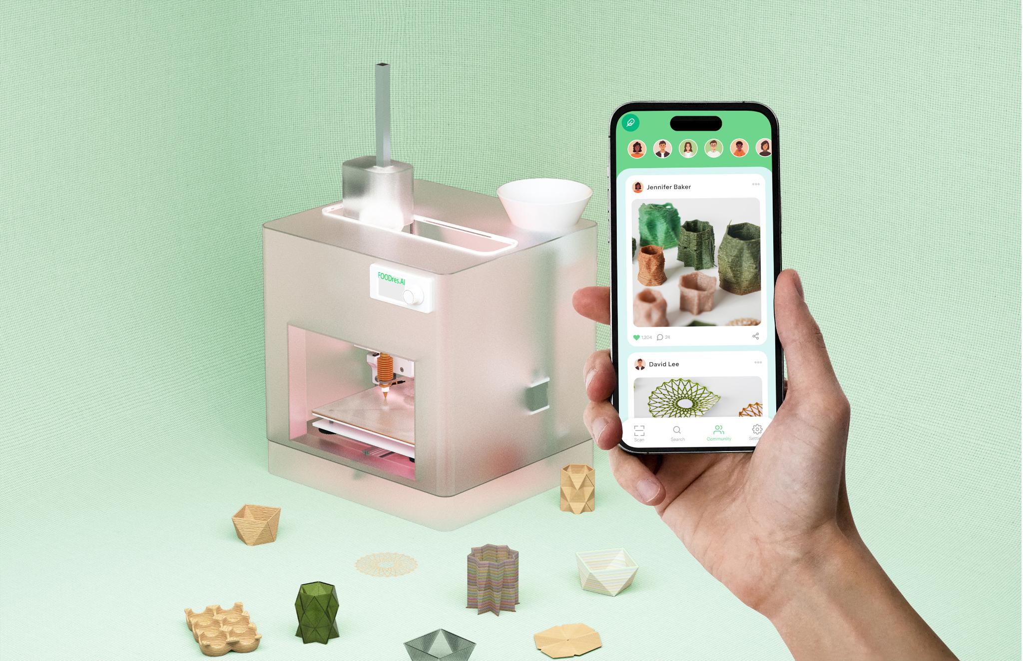 The FOODres.AI Printer transforms everyday organic scraps into functional and decorative products. Users simply deposit food waste into the machine, select a design via an app, and print items such as coasters, cup holders, or custom-designed décor. By integrating food-saving technology with design, the printer demonstrates how discarded organic matter can become a resource rather than waste.