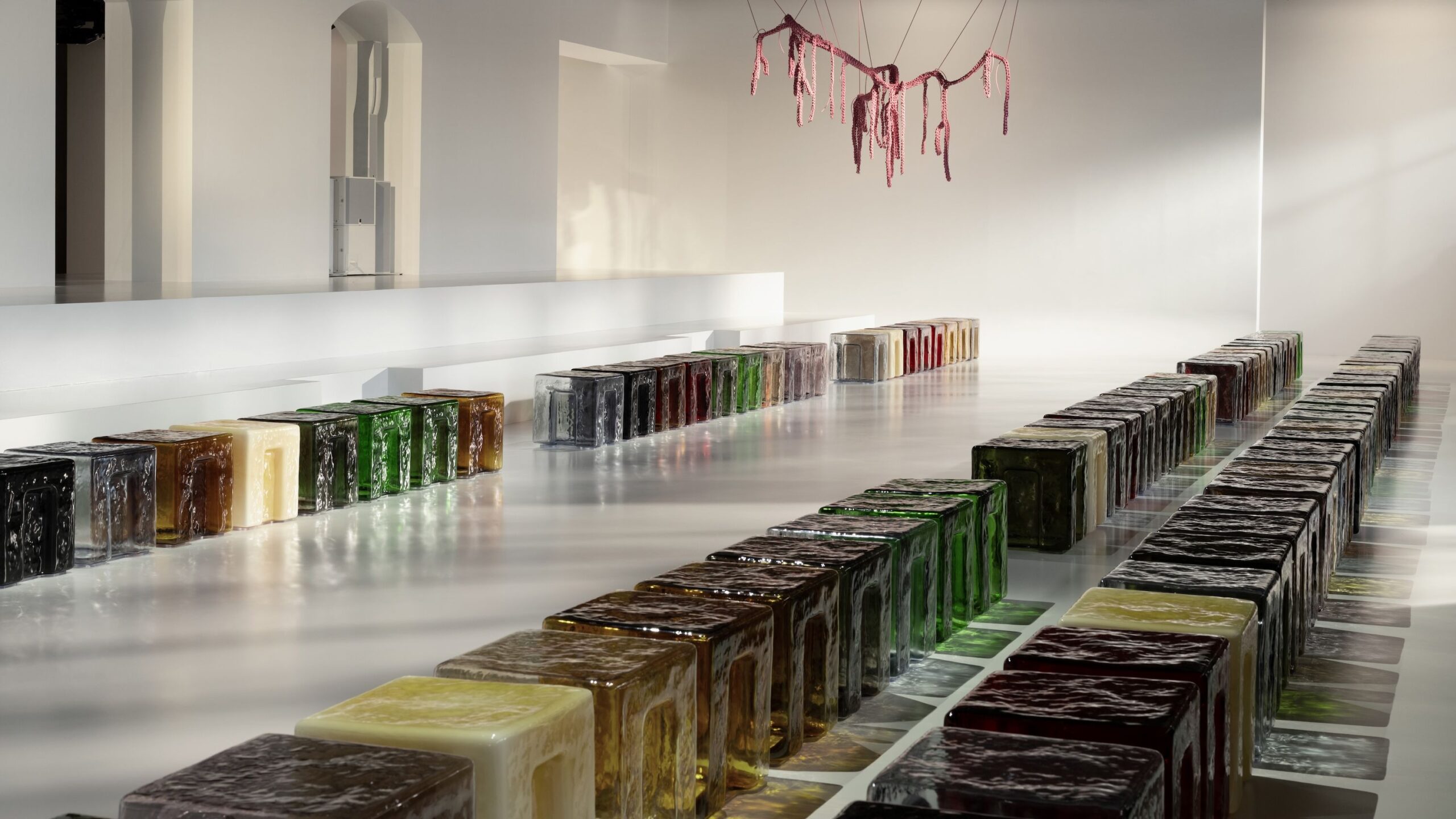 At the Bottega Veneta Summer 2026 show in Milan, Italian design studio 6:AM transformed the runway into a shimmering landscape inspired by the sea. The event featured a collection of translucent Murano blown-glass stools, each reflecting the movement and colour of ocean waves.
