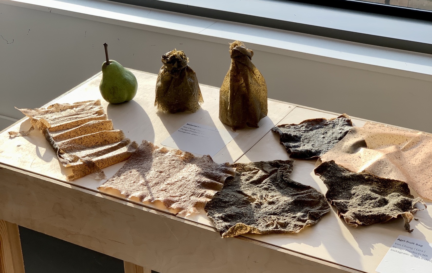 Eggshells take centre stage as a versatile resource. Eggshell Re-Planter applies an improved eggshell-ceramic bio-material to planters that release calcium back to the soil at end of life, while maintaining strength and water resistance for interior use. PROJECT SHELL: Egg the paper turns eggshell pulp into biodegradable lamps—some seeded to decompose and enrich soil—offering a full life-cycle concept from table to garden. From Waste to Gold outlines a practical route from local waste feedstocks to high-performance biomaterials, prototyping products and building regional supply chains in months rather than years. Similarly, Agri-fruit-bag transforms agricultural waste—specifically discarded tomato leaves—into a biodegradable biofilm used to protect guava fruit, replacing conventional plastic mesh bags and returning nutrients to the soil after harvest. Also featured, Between Growth and Structure presents a plant-based biomaterial made from carboxymethyl cellulose, brown-algae sodium alginate, and organic residues. The material’s adaptability—from flexible films to rigid structures—makes it suitable for applications across fashion, furniture, and architecture, combining circular design with low-carbon performance.