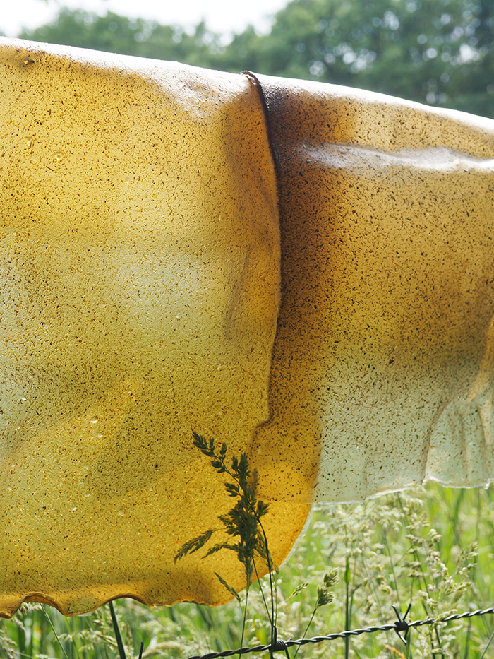 At the Veenweide Atelier, Fit-to-Farm – Models for Biomanufacturing explores bacterial pigments powered by agricultural side streams and residual farm heat, sketching a pathway to distributed, lower-impact textile finishing. Wax meets Flax documents more than sixty recipes for water-repellent linen using beeswax, linseed oil and natural resins—offering PFAS/PTFE-free performance with reproducible methods. More than a Bioplastic transforms yerba-mate waste into large bio-textiles that connect cultural ritual with circular material practice. In MandarinSkin, Roots & Flowers, couture pieces made from dried flowers, roots and organic residues demonstrate toxin-free, repairable, skin-friendly materials engineered for stage-ready durability.