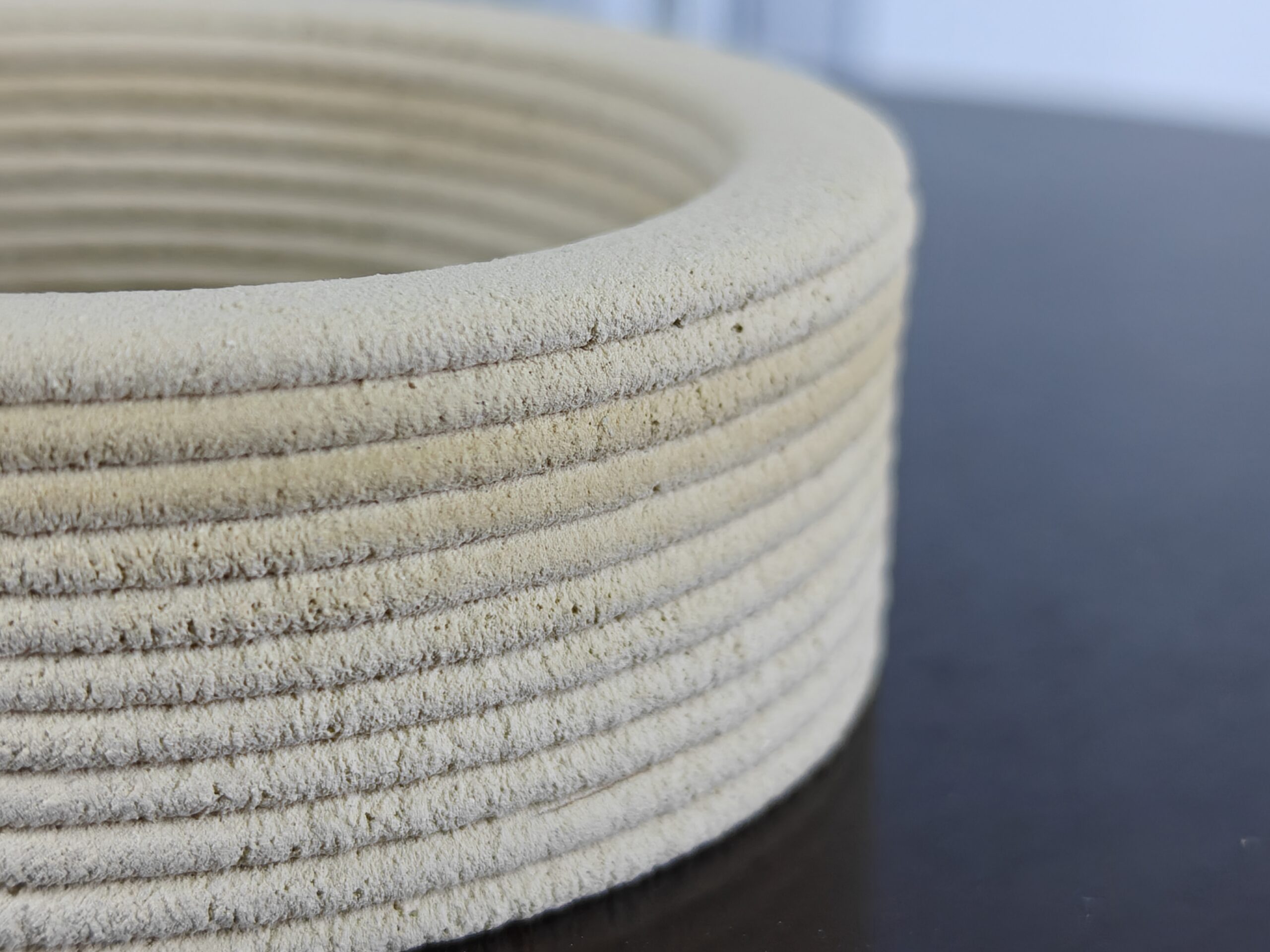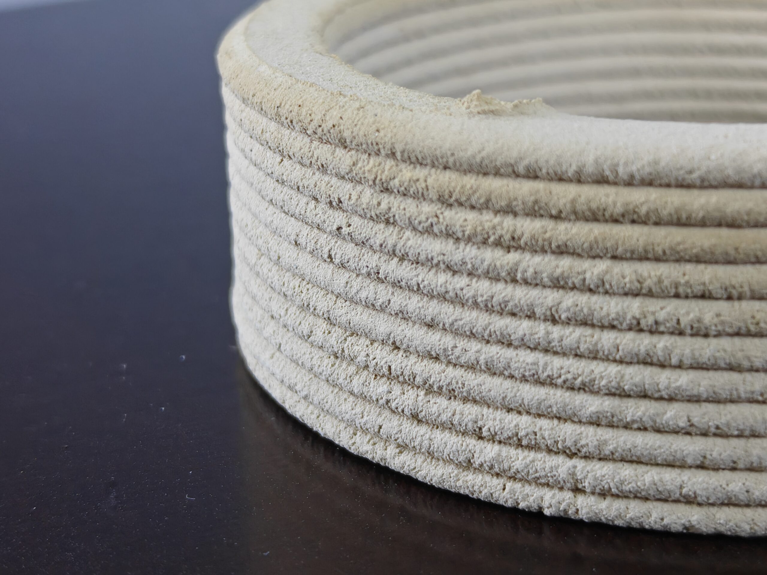 The resulting material is visibly stratified, recording time, gravity, and process through its layered surface. Free from the constraints of masonry, its porosity, density, and geometry can be locally varied, enabling structural optimisation, environmental performance, and formal specificity. Geological origin remains legible, while form and function are liberated.