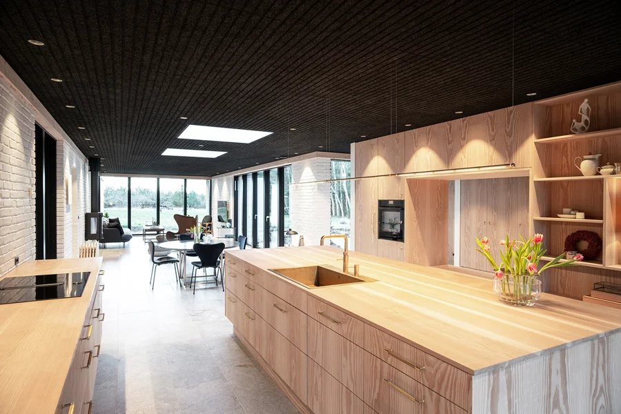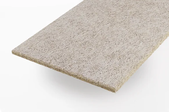 The panels are made from cement-bonded wood wool, combining certified wood fibres with cement to provide sound absorption, structural stability and fire resistance. Depending on thickness, surface structure and installation method, the panels can achieve high levels of sound absorption, making them suitable for acoustically demanding environments such as schools, offices, cultural buildings and residential interiors.
