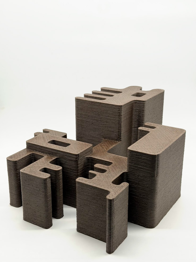Coffeefrom® PBS is a biobased and renewable material composed of polybutylene succinate (PBS) and industrial coffee grounds (10%). It offers good tensile and impact resistance with excellent ductility, making it well suited for both injection moulding and extrusion-based 3D printing. The material enables the production of functional, durable components while supporting circular material flows. On final products, Coffeefrom® PBS reveals a slightly textured, natural surface that expresses and celebrates its coffee-based origin.