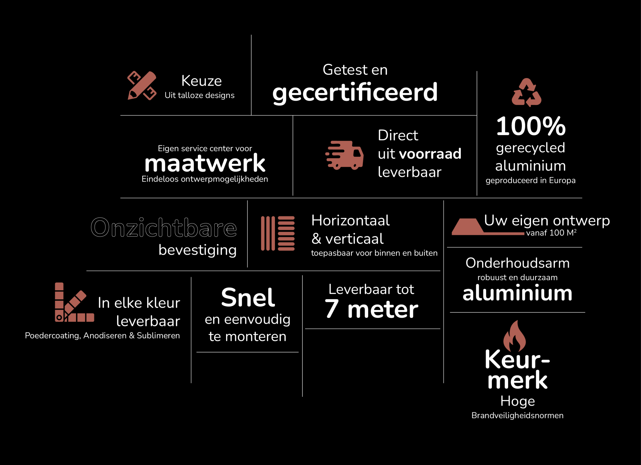 All profiles are made from 100% recycled aluminium and are designed for a long service life with minimal maintenance in line with circular construction principles.