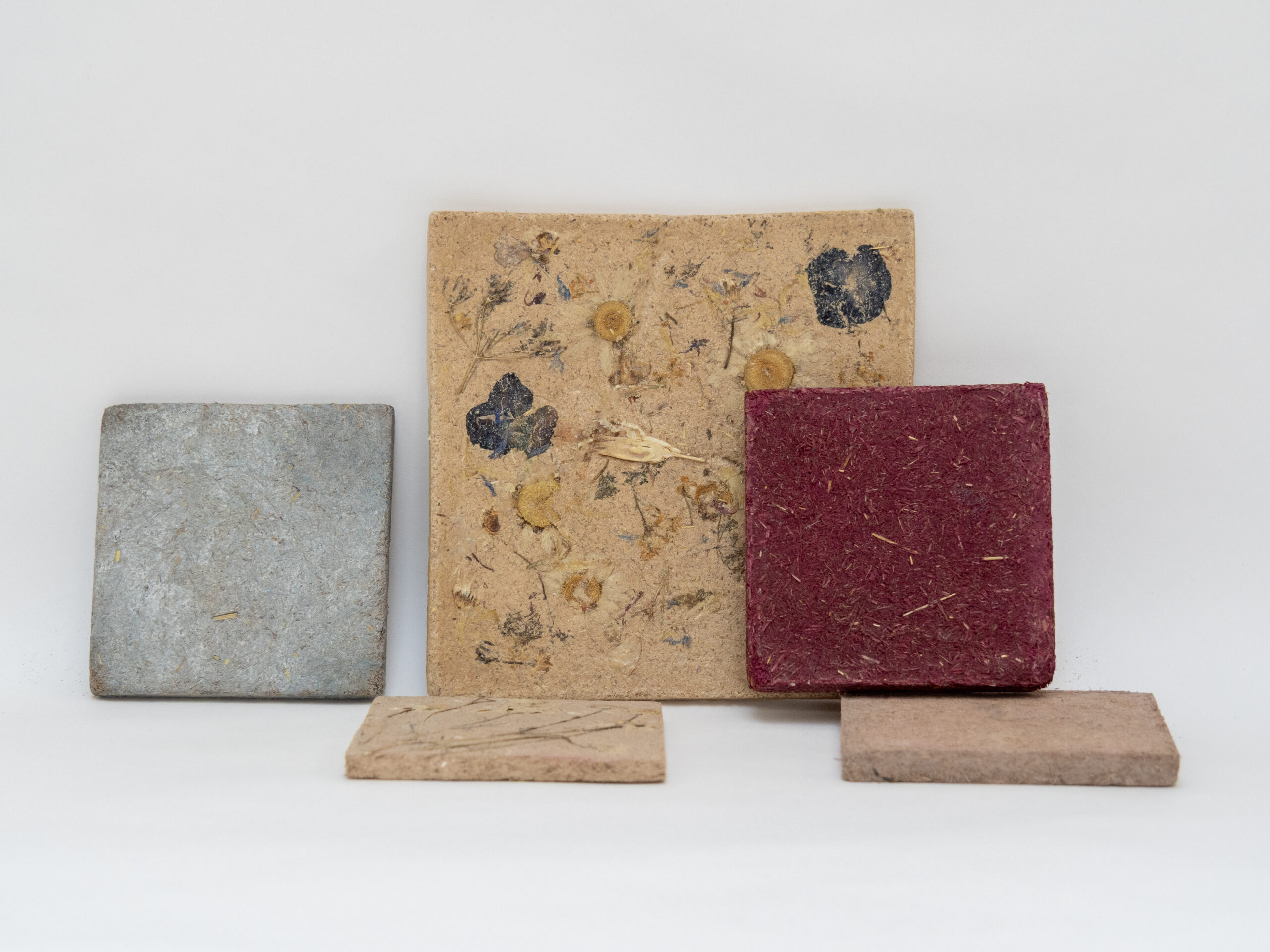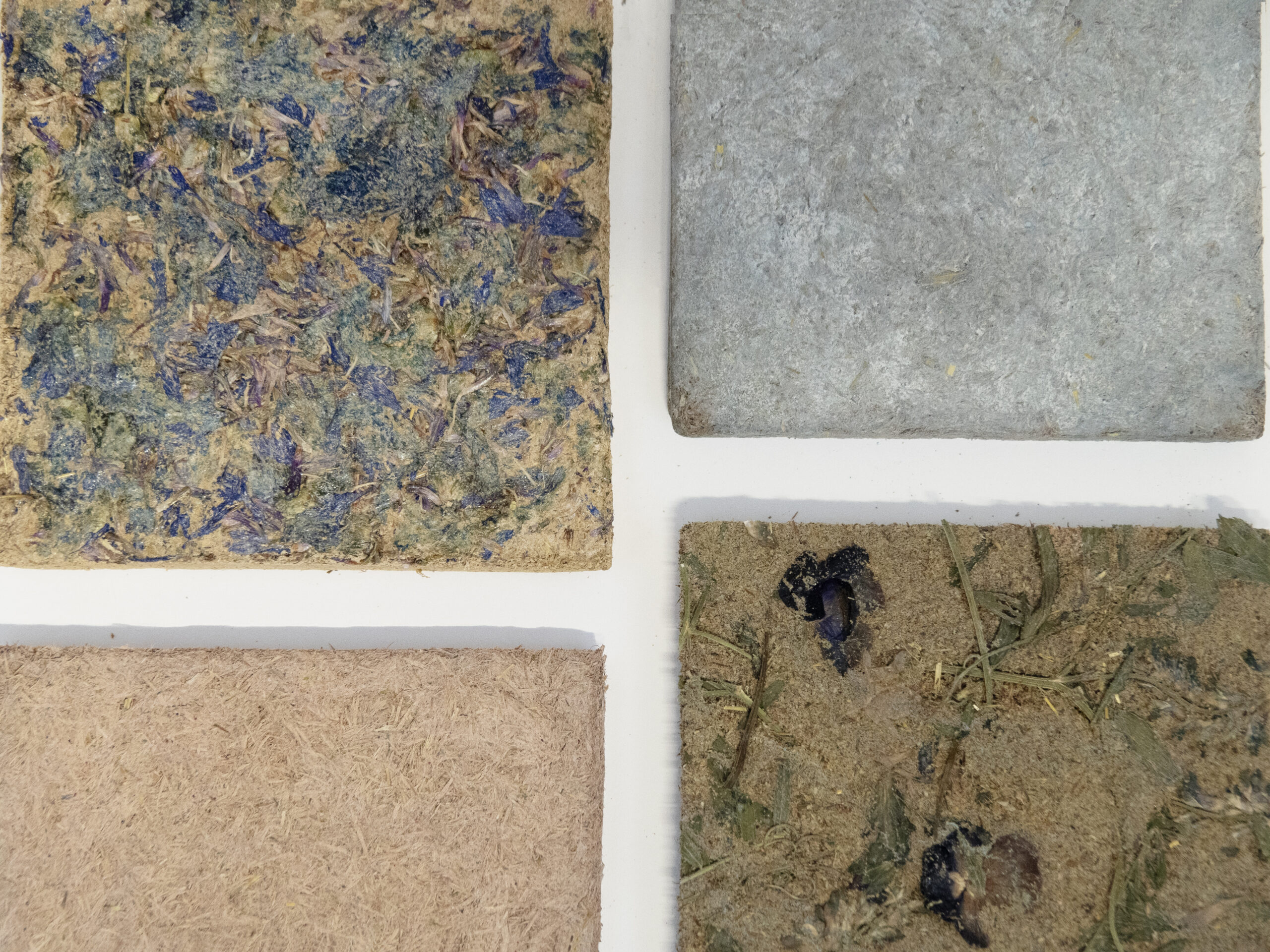 As an alternative, GreenEdge is a biobased sheet material designed for interior applications. It consists of approximately 40% roadside hay and 60% waste wood from CNC milling processes. These fibres are bound with casein, a natural milk protein adhesive with a long-standing history in furniture and product design. Natural pigments and flowers are used to colour and enrich the surface, resulting in a material that is biodegradable, toxin-free, and conceived with circularity in mind.