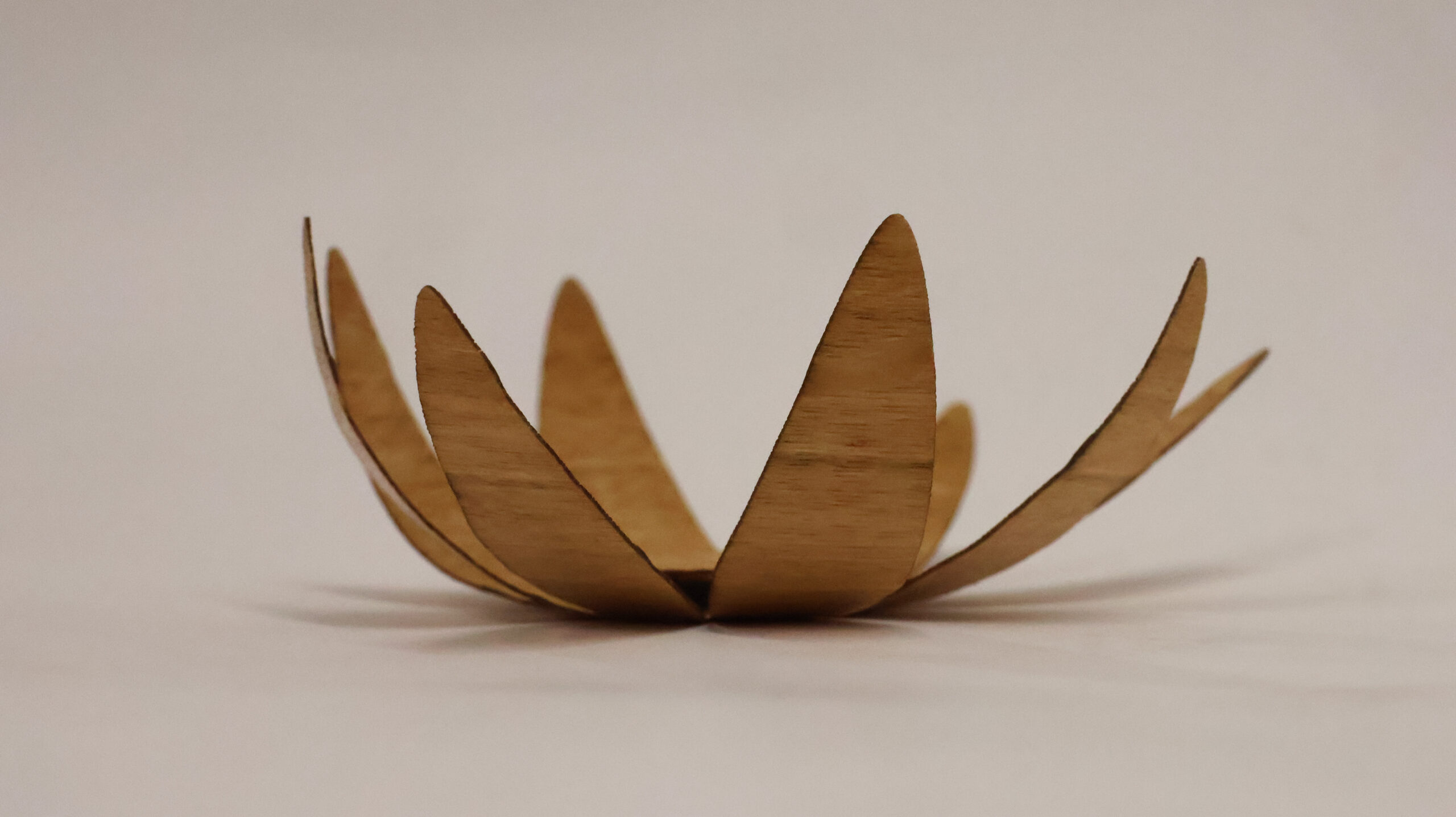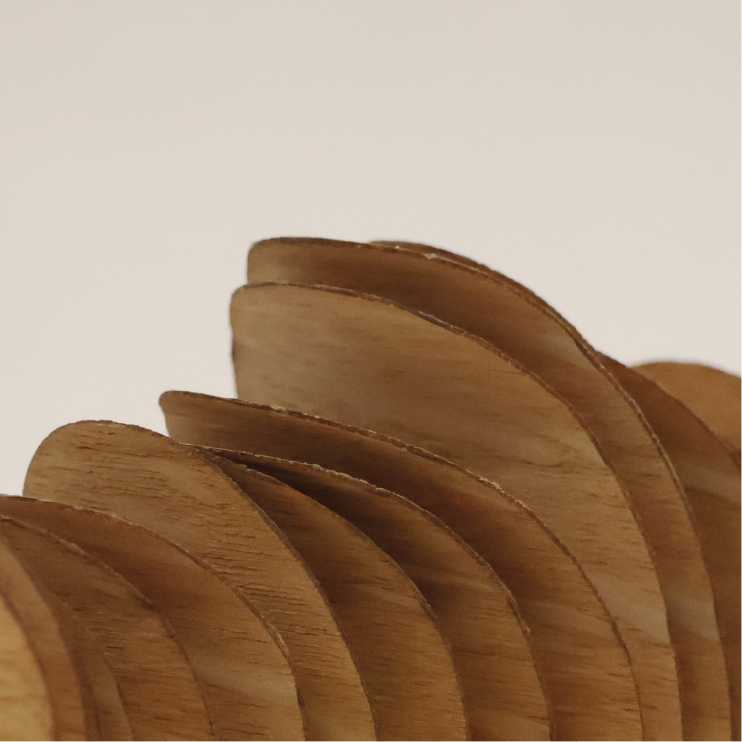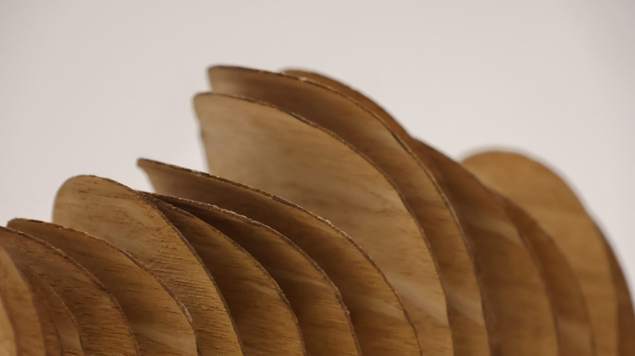 Changing the fibrr direction of the veneer controls the visual direction of bending, which is always perpendicular to the fibre orientation. The result is a material that can be formed into panels, surfaces, or other custom geometries and bends bidirectionally with changing moisture. This material can be used for indoor applications such as responsive surfaces, shading elements, and installations.