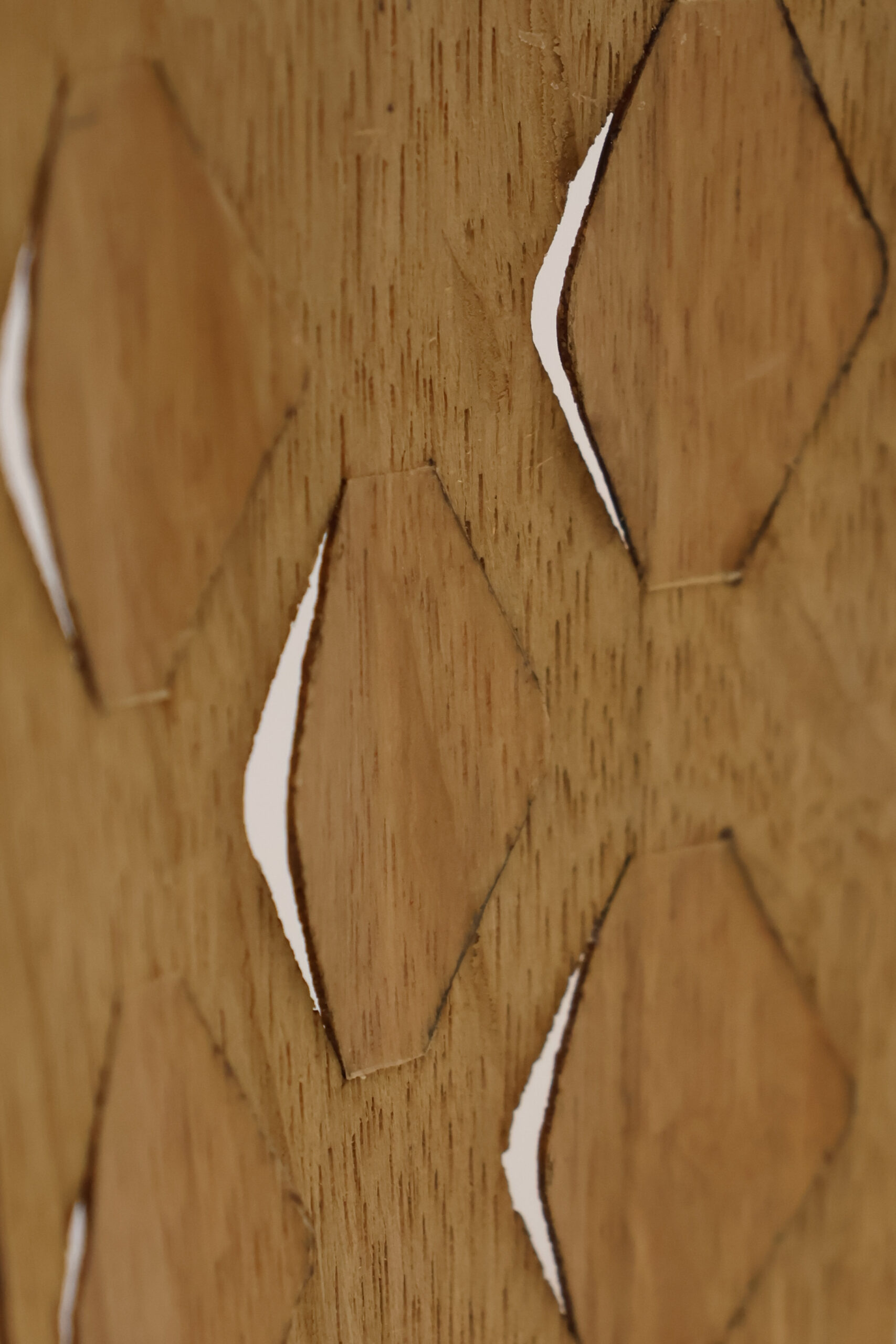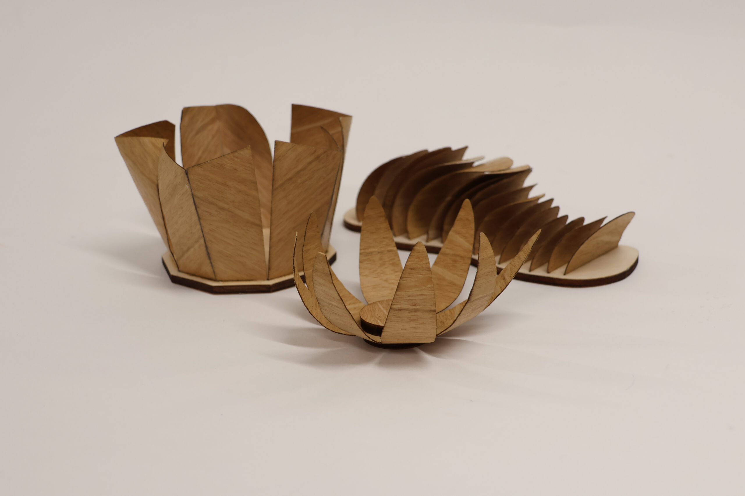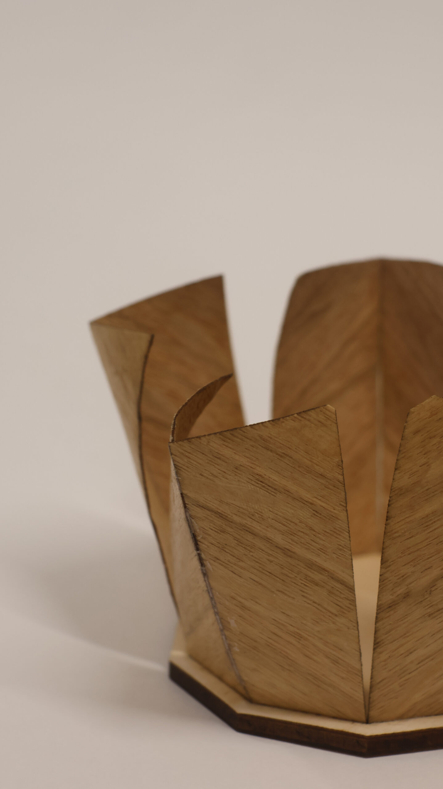 Changing the fibrr direction of the veneer controls the visual direction of bending, which is always perpendicular to the fibre orientation. The result is a material that can be formed into panels, surfaces, or other custom geometries and bends bidirectionally with changing moisture. This material can be used for indoor applications such as responsive surfaces, shading elements, and installations.